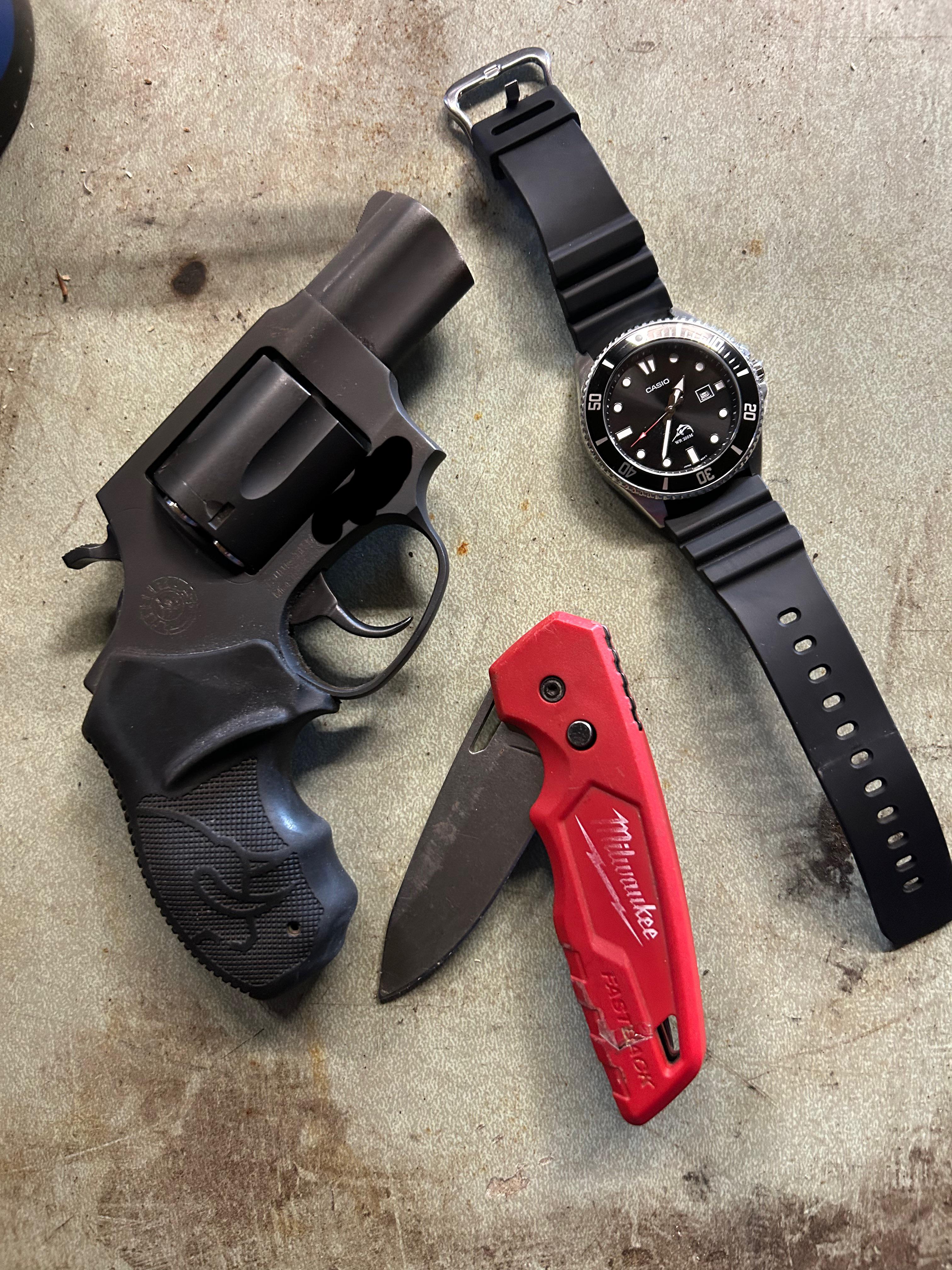 Taurus 85, Casio duro, and Milwaukee knife