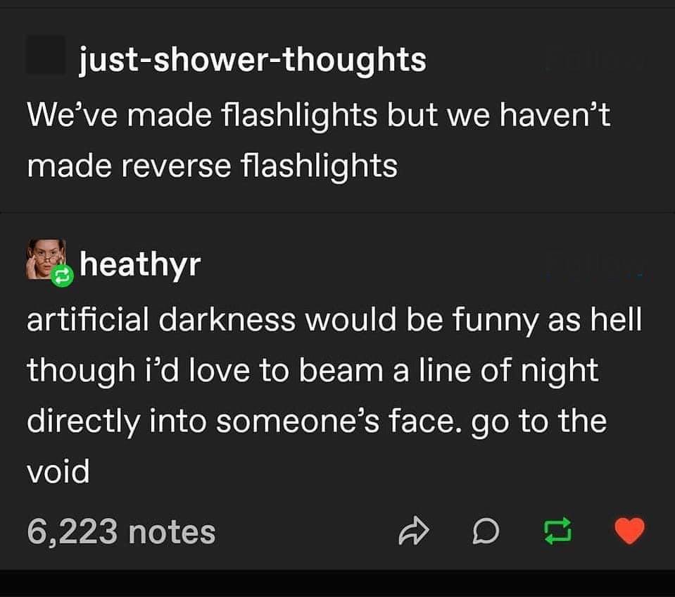 In Flashlight Saw this and laughed… December 27, 2022 Who else would like to shoot a beam of darkness? I know I would… hehby mikmills775 flashFlashlightlight Prev Post When going stealth December 27, 2022 Next Post Doing cyber stuff with the cybertool. December 27, 2022 Related Posts Q8 plus fun (6500k) January 18, 2026 Z1 SFT42r heavy fog January 18, 2026 Family photo January 18, 2026 2 Comments mrturtleballs 3 years ago If it’s bright enough they will see darkness…. Puzzleheaded-Bat8890 3 years ago I NEED this in my life.Write A CommentYou must be logged in to post a comment.