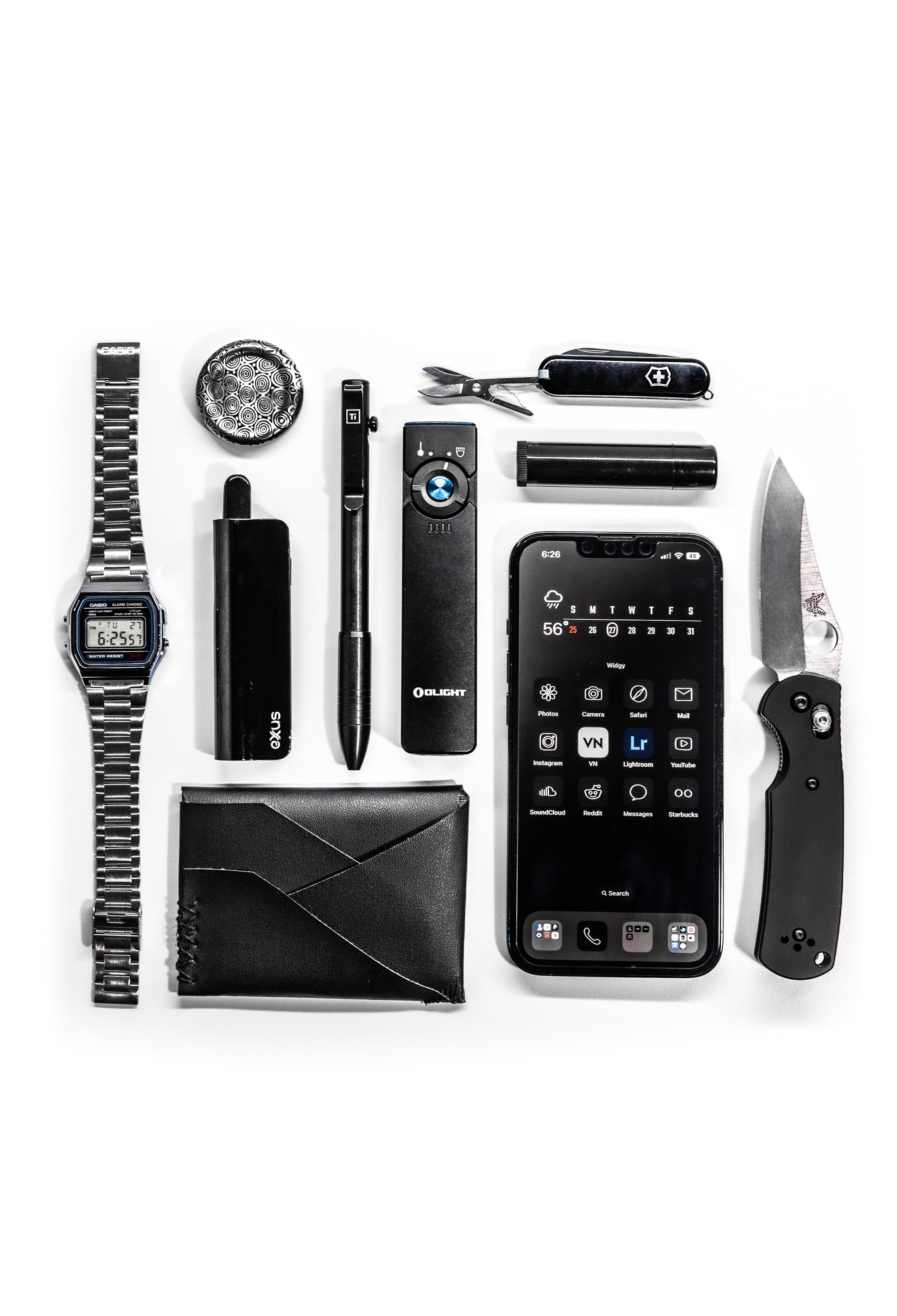 First Is my Casio A-158, next to my Custom Leather Wallet, Wax Pen, and Damascus Fidget. I use a Olight Arkfeld, and a Big Idea Design Bolt Action Daily at Work. My Benchmade Mini Grip has a Reverse Tanto Regrind and AWT Aluminum Scales as well as a Mini Deep Carry Clip. My iPhone 13 Pro with some Widgets and a Victorinox on my Keychain!