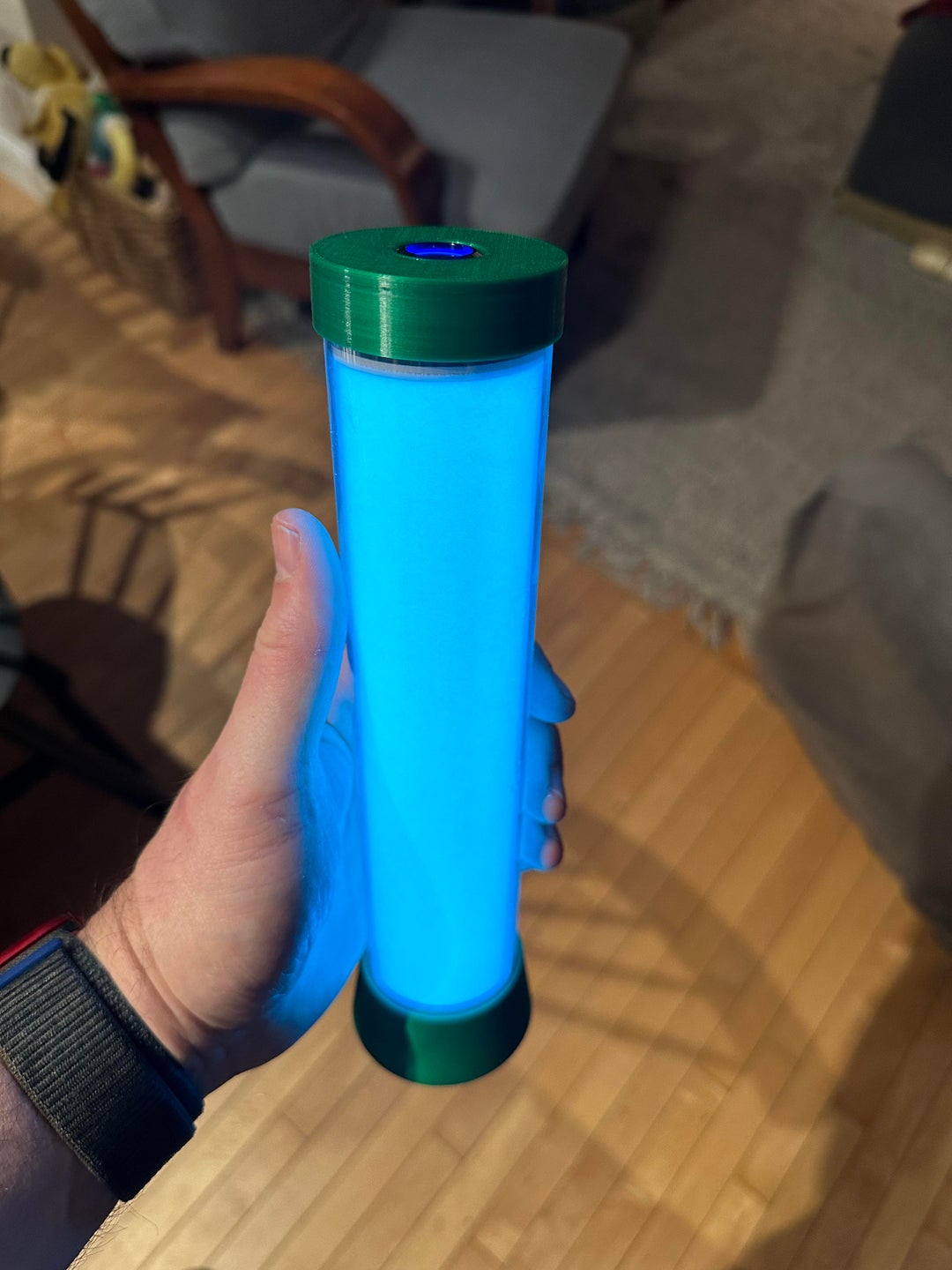 My holiday project this year was building extra large glow tubes – essentially Krill on steroids. My first prototype was a mess – I added clear epoxy to seal the inside of the tube and it leaked everywhere, but the [20cm x 15cm electroluminescent panel from Adafruit](https://www.adafruit.com/product/414) and a 50mm OD acrylic tube from Amazon were keepers for the next attempt. I designed and 3D printed end caps and some internal tubing to keep the panel in place, and it all came together pretty nicely. The switches are inset, so the magnetic ends let you attach either end to something. I’ve got thin rubber matting on order so they will hang sideways – the magnets are [edit] *strong* enough, but the plastic slides. 8 AA cells power them. They are quite bright, all things considered, for about 8 hours, and they were still going 20 hours later when I stopped the test, but they were fairly dim.