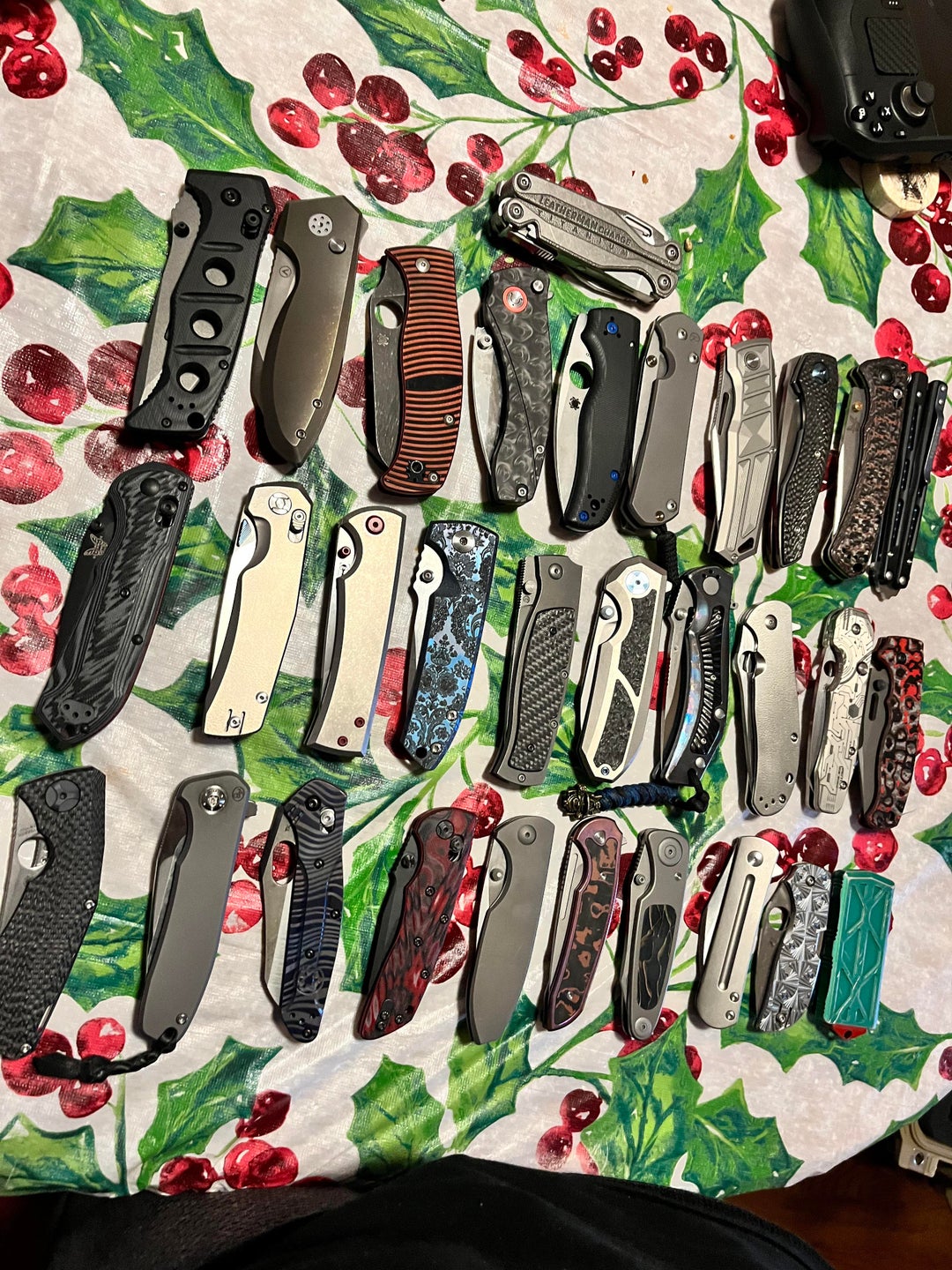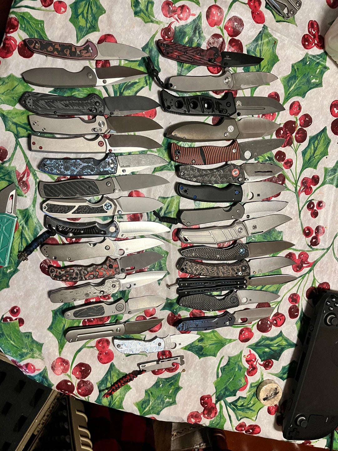 Left to right starting from top – full size adamas in cruwear ( a fucking animal for hard use I absolutely love this knife) – full size slim pickins (stupid great slicer) – spyderco carribean (one of my favorite spydies) – Orion solaris (the only knife in my collection that was less than 100$ it’s that good) – shaman what else do I have to say about it ? – crk large seb in magna (could be my one and done edc it’s great) – Krystal bronze horseman 2 (love the design and is a great mid use knife) – Ckf gratch (the carbon fiber is sooo nice and I love the blade shape) Customized crooked River (just got this. Don’t know how I feel about it just yet.) – bm 51 (a great balisong that’s also a great user.) – bm super freek – kunwu X Tao ( the smoothest axis style knife I ever handled. Beats the anthem) – Chavez liberation (got it this year and I love the design) – Les George vecp (it was modded and now it’s my go to fancy knife for parties.) – large striz ( great knife. Just a little too simple of a design for me.) – bade modern designs stunner (could also be my one and done edc. Love it) – Wilson combat rapid response xl (it’s an okay framelock i got it when I first started collecting and because of that it’s staying) – spyderco advocate – Spyderco smock – spyderco drunken ( my favorite spyderco. The blade, the handle it’s just way too nice. Underrated imo) – Arno bernard imamba (great knife. Feels like how a crk would in bearings.) – modded bm 940 with tk reblade – hogue deka – jik knives Fuze (super underrated because of the recurve but this thing slices like crazy) – anod ferrum forge stinger with cf/copper inlay – mass drop gratch – ezw slayback – spyderco stepped ti chapparal (second favorite spyderco) – microtech Exocet bounty hunter