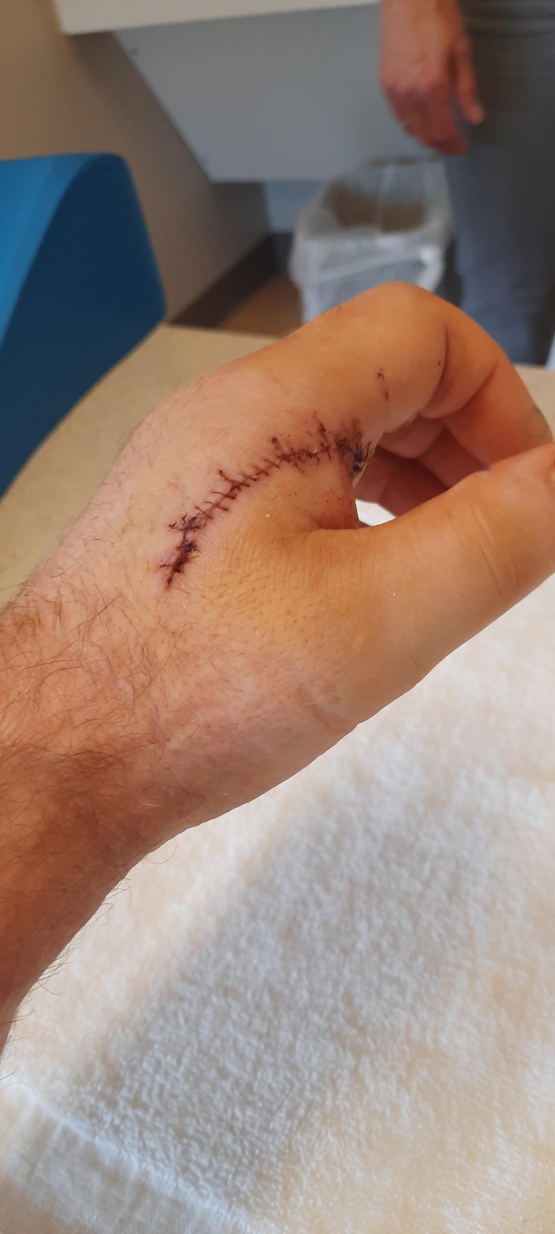 Well fuck, that looks shitty. Hopefully everything heals up fine and will be good as new. Definitely gonna be a gnarly ass scar when its healed up