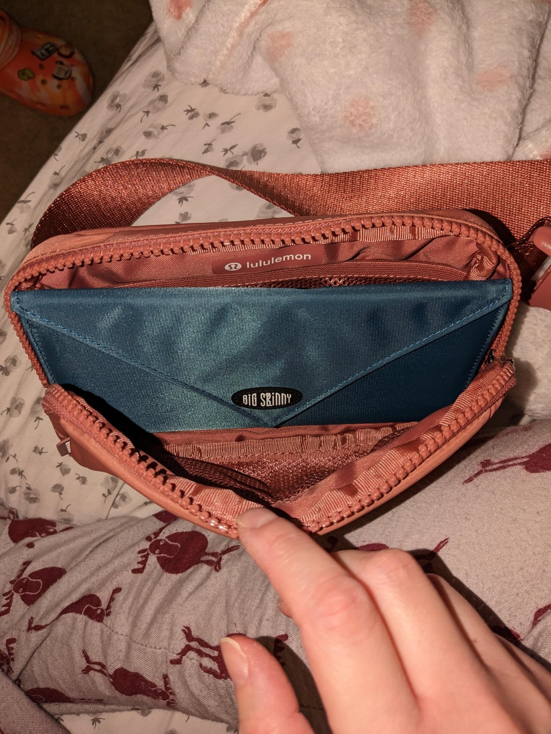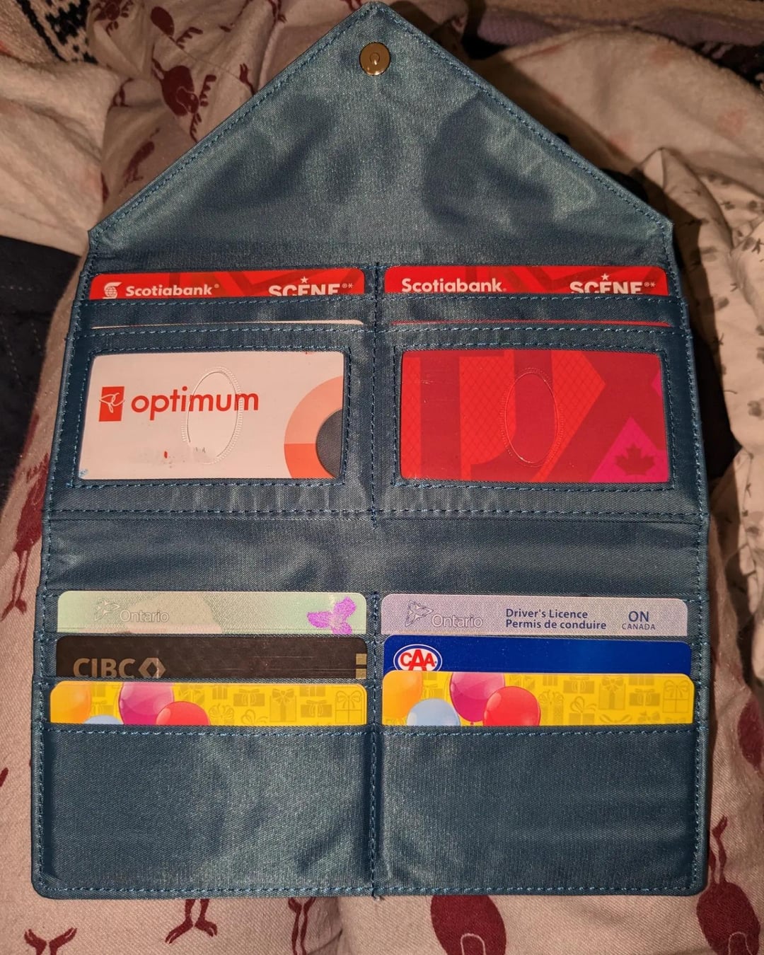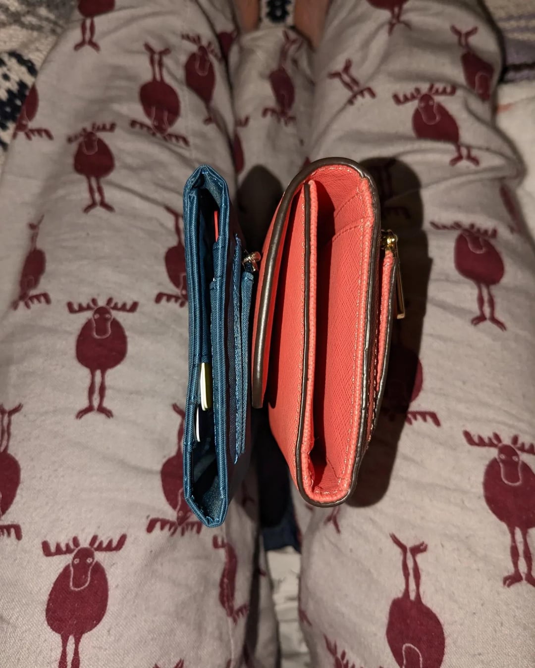 10 card slots that can hokd multiple cards (on the site this wallet is advertised as having 40 card capacity). 2 bill sections, one of which has a divider. And along the back is a full zipper pocket. The black bag is the 2L, the pink is the 1L.