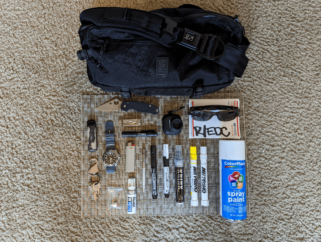 Chrome industries BLCKCHRM sling, Smok Novo 2, Nitize keyrack, Spyderco para 3, Leatherman micra, Streamlight microstream USB, Seiko samurai, Bic lighter, NYC fat cap, Pentel shorty, glass scribe, 2X Pentel MMP20 paint markers, glass body magic ink marker, Krink K-75 paint marker, 2X Art Primo solid paint makers, airpods, Ray-Ban new wayfarers, USPS slaps, and a random dollar can.