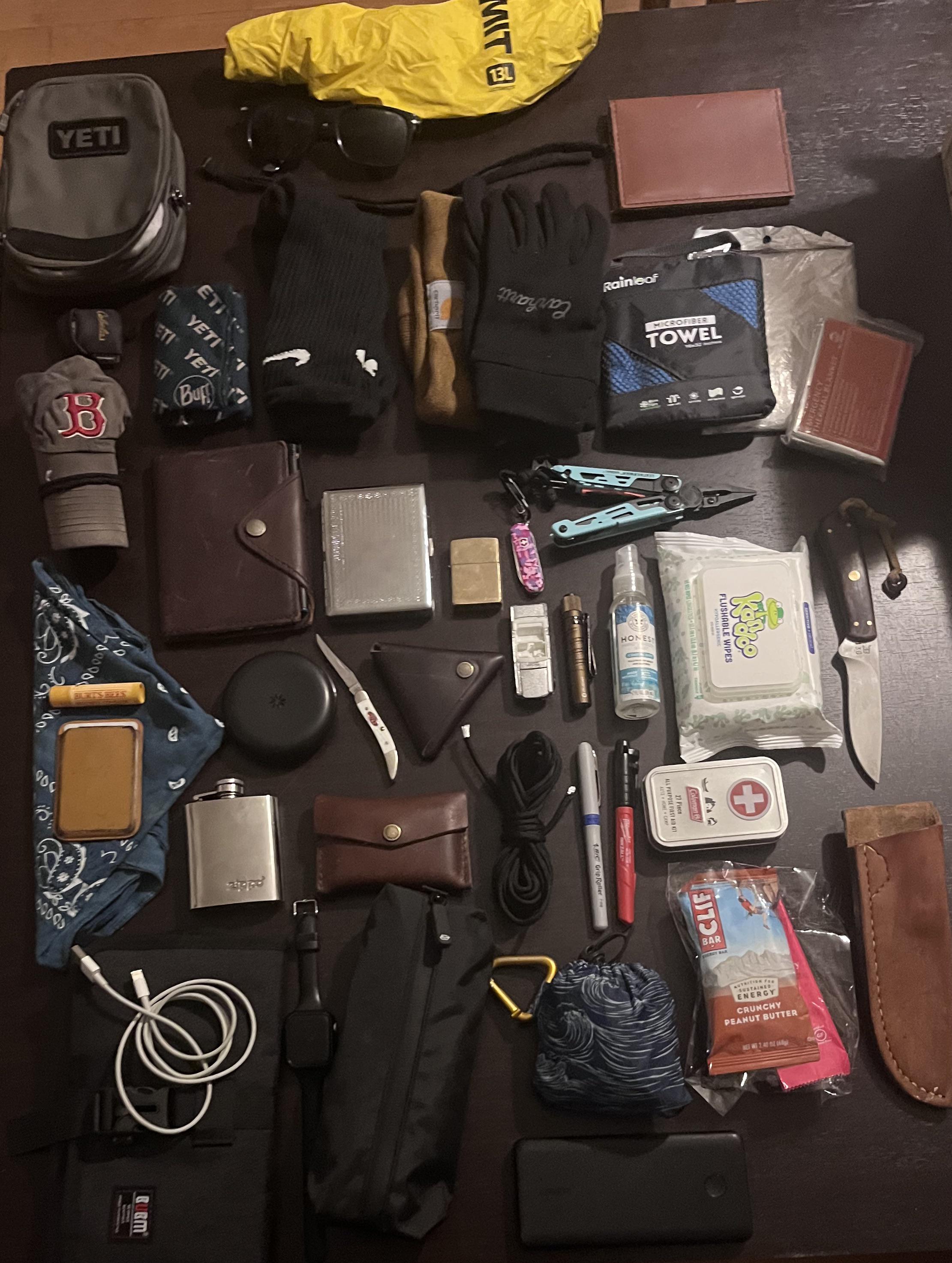 Small yeti packing cube (houses hat/gloves etc) -13l sea to summit dry bag (can fit my laptop and electronics if needed)- prescription sunglasses with strap -Portland leather folio (cards, cash, coupons) -cabelas glasses cleaner -buff neck gaiter -spare nike socks -Carhartt hat and gloves -mini towel, poncho, emergency blanket -baseball cap and hair elastic -Portland leather journal -cigarette case – brass zippo -leatherman signal with victorinox small Swiss army -bandana -Burt’s bees lip balm -apple MagSafe wallet -Invisalign container- case toothpick knife -Portland leather coin pouch -hot wheels car (if a kid gets bored) -olight flashlight -spray hand sanitizer -flushable wipes -fixed blade and sheath below it -zippo 3 oz flask with demon seed whiskey -Portland leather wallet for cards -paracord length -bic pen/ Milwaukee inkzall- Coleman mini first aid (added a few things to it) -cable pouch with phone/watch/ various chargers -Apple Watch- toiletry bag with basics (add a bit more to my duffel if traveling more than a day) -packable shopping bag -snacks (clif bar, granola bar, fruit leather) -anker charger