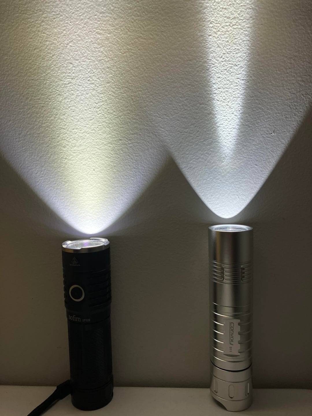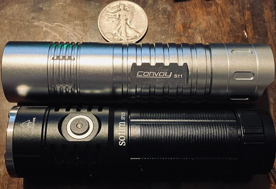 Received my Convoy S11 today with the SFT40. Heck of a light and while it isn’t the easiest carry in jeans, it certainly works well in a jacket pocket. For comparison I’ll show some side by sides with the Sofirn SP33S with the XHP70.2. Similar form factor, very different lights. Both of these are monsters in their own way and are worth a look. The only real draw back I see is the 26650 battery, which just doesn’t offer a lot of options, but the extra thermal mass gives this form factor a thermal mass advantage, thus slower step downs at higher modes.