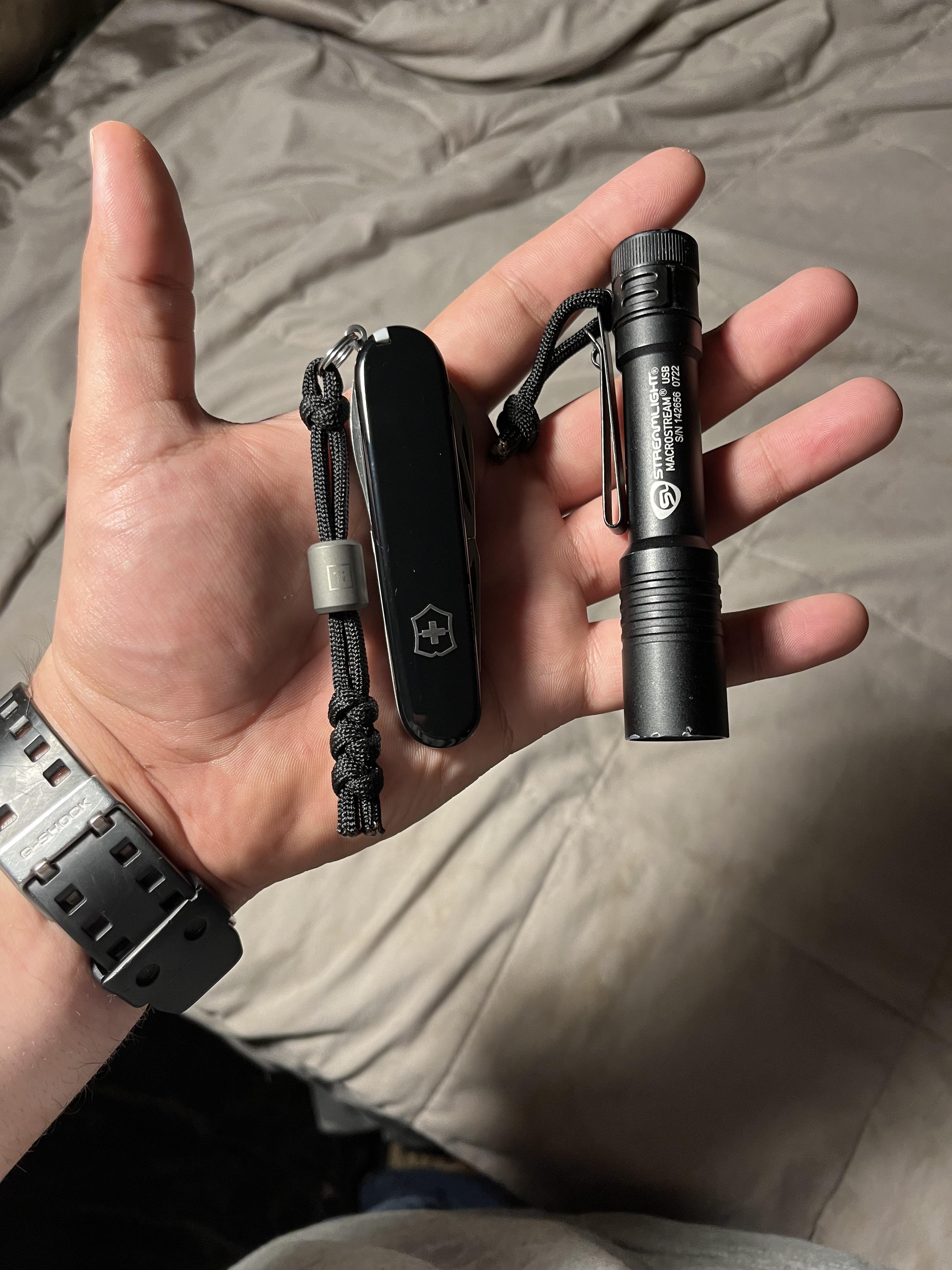 Black Swiss Army knife tinker with the big idea design Titanium lanyard bead and the streamlight micro stream big brother. And yes I did make my bed to just take this pic haha.