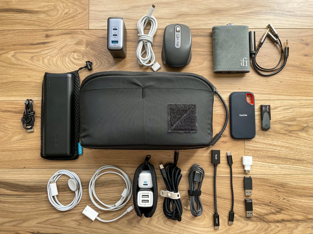 * Anker 736 charging block * Macbook Pro charging cable * Logitech MX Anywhere 3 Mouse * iFi Hip-DAC2 * SanDisk Extreme Portable 2TB SSD * Anker PowerCore 20100 portable charging bank * Extra charging blocks, various cables, converters