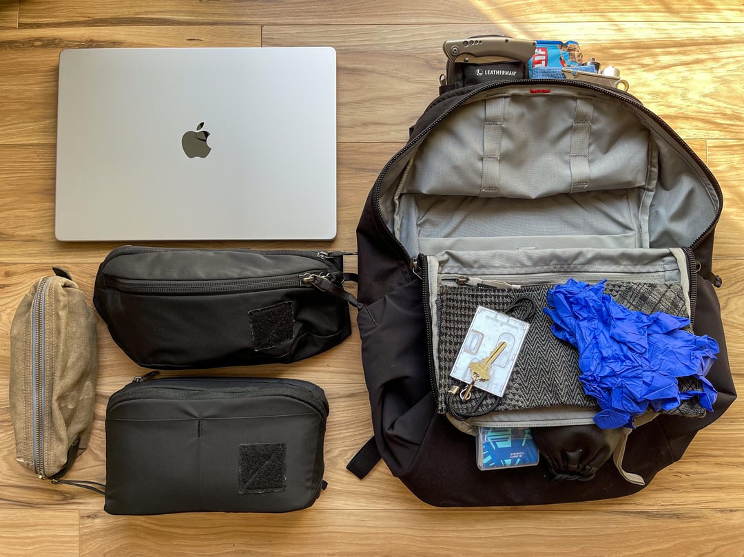 * External quick access pocket: Gumbiner Custom Knives Omen #23, Leatherman Charge+ TTi, 2x portable pill cases, Screwpop utility knife, microfiber towel, Cliff bar * Internal pocket: Koss Porta Pro with Yaxi Earpads, Swank hank, hospital ID badge, latex gloves, gum * 16” Macbook Pro * CAS2 * CAP2 * Wax canvas pouch (forget from where)