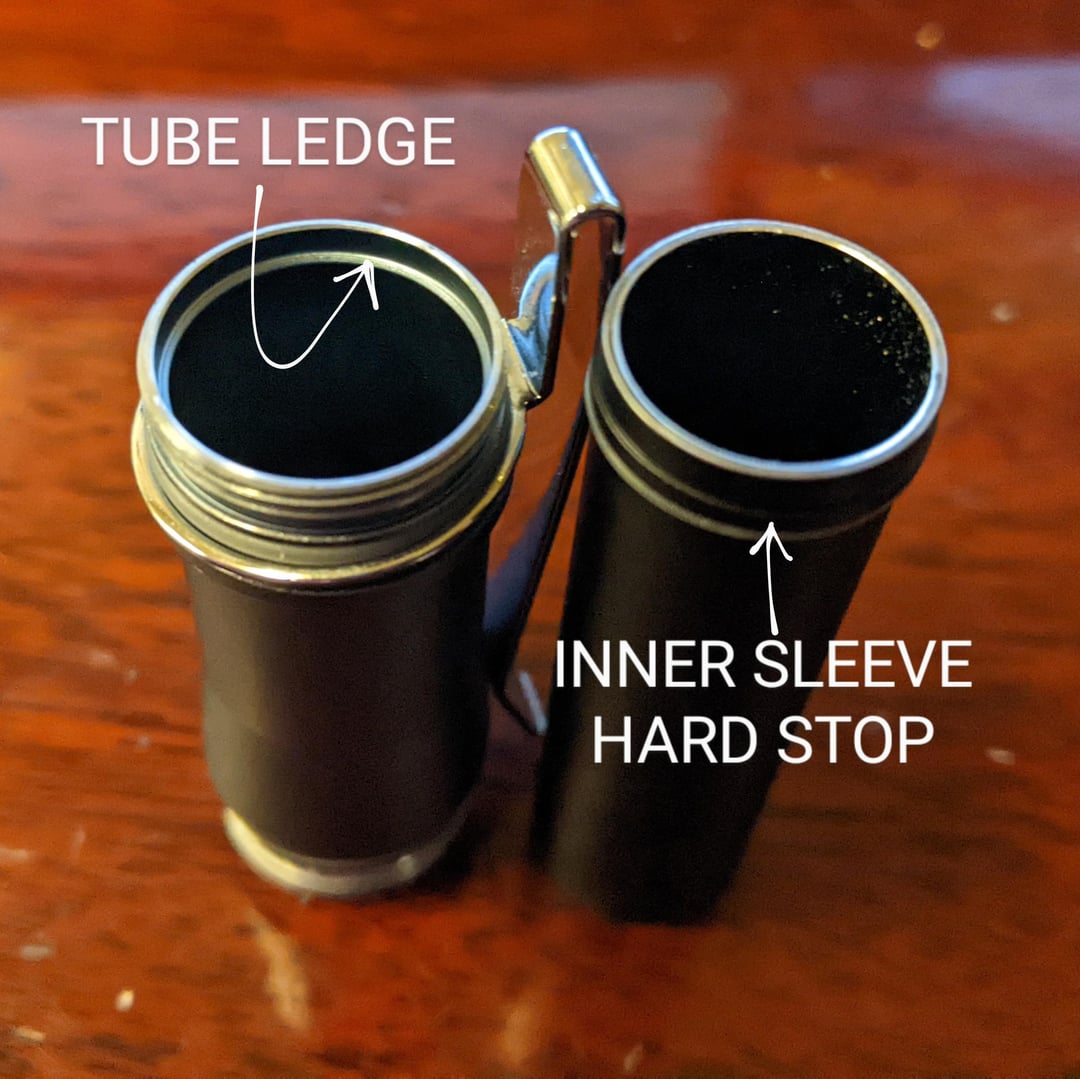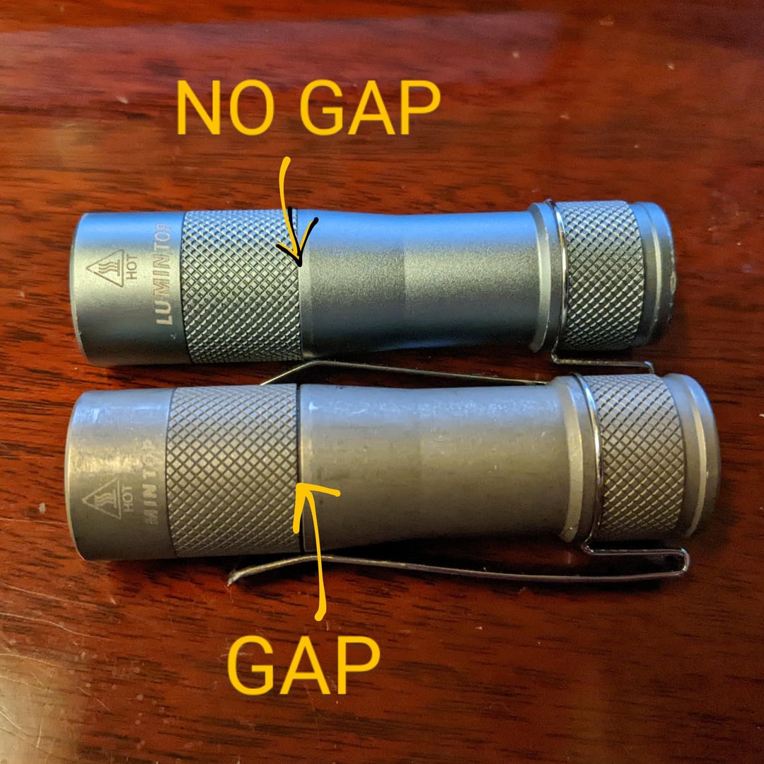The process for tightening an FW series light is with the head loose tighten the tail then tighten the head. I’m not sure many people understand why this is the case: it’s because the inner sleeve only has a hard stop on one end (the tail end). If you tighten the head first then you can’t get the tail tight enough to hold the clip down. The length of the inner tube varies light to light so they end up with a gap of varying width at the head (if you follow the tightening procedure).