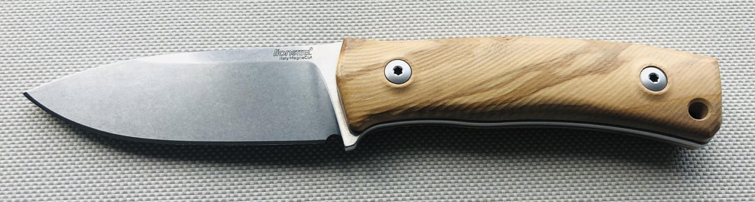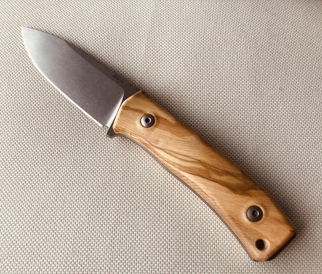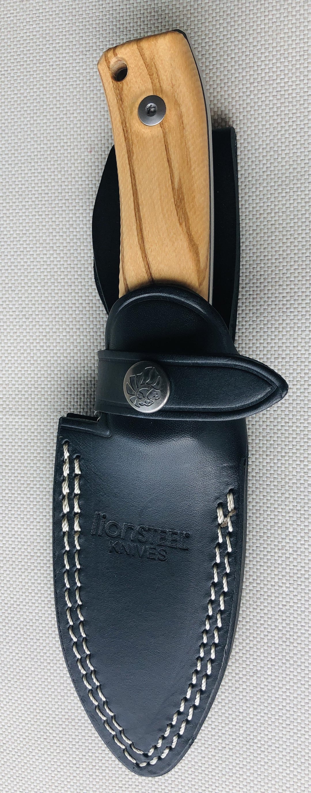 Lionsteel M4, CPM Magnacut blade & olive wood handles plus a beautiful black leather sheat with a Lion 😀