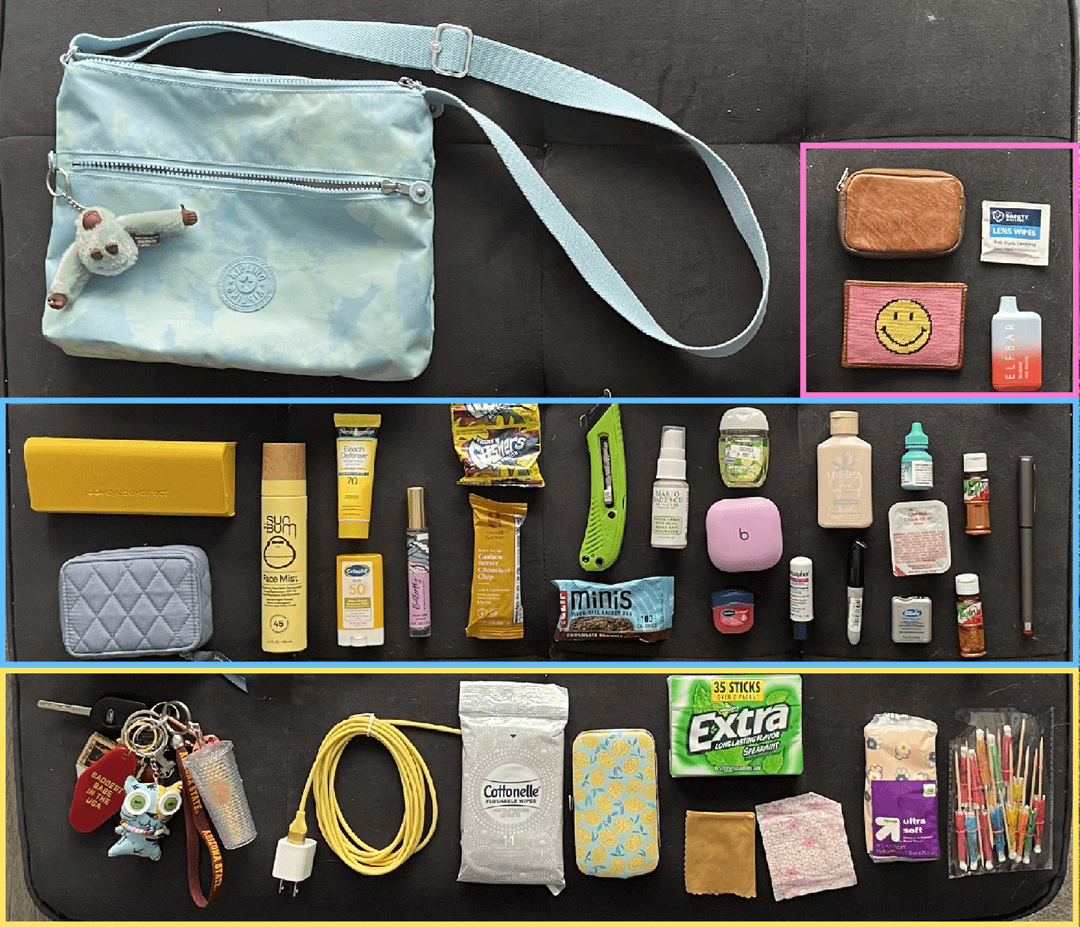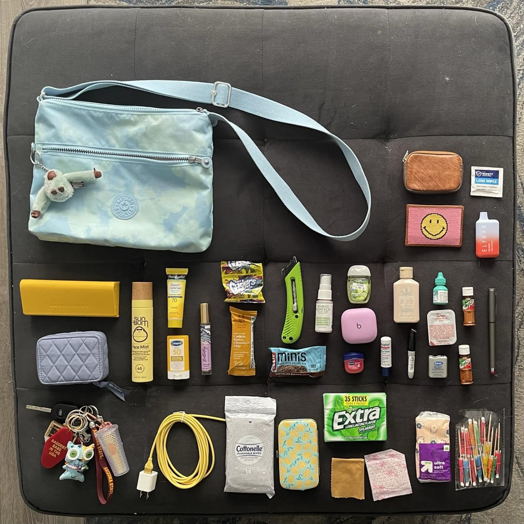 Blue box contents: prescription sunglasses in their case, travel pill case, SPF face mist, sunscreen stick and lotion, perfume, snacks, box cutter (for work), face mist 2: electric boogaloo, hand sanitizer, bluetooth headphones, tinted lip balm, SPF lip balm, lotion, mini marker, eye drops, chicken nugget sauce, floss, tajin, spicy chicken seasoning (in a tajin bottle), and pen with stylus bottom.