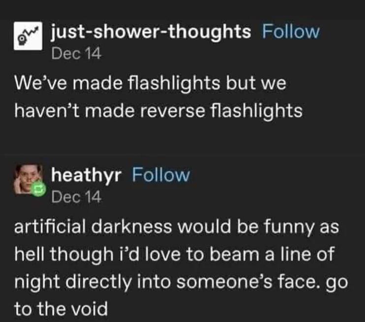 Ok, to be honest if someone can make a reverse flashlight, I am buying it for sure