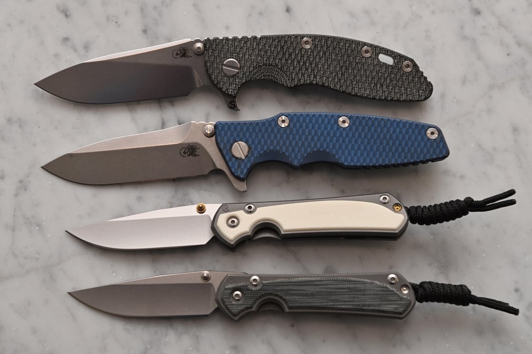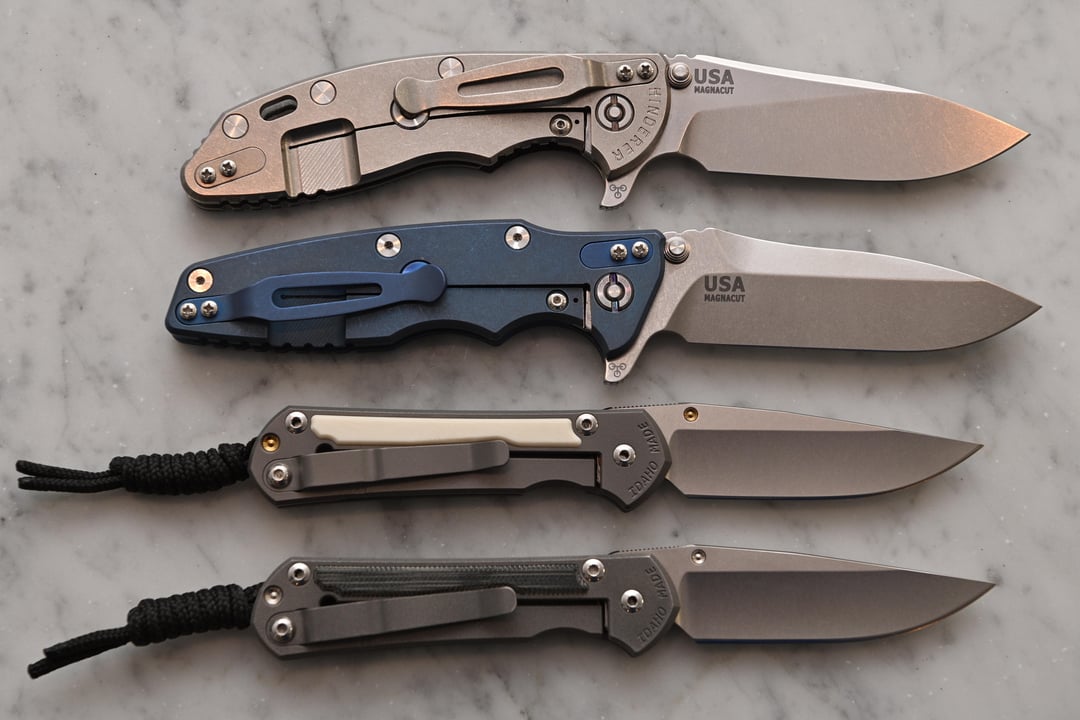 Hello knife friends. I hope your Monday was well. From top to bottom all in MagnaCut: Hinderer XM-18 3.5 Skinny Slicer, Hinderer Eklipse 3.5 spear point swedge, Chris Reeve small Sebenza 31 with Elforyn Super Tusk inlays and finally a Chris Reeve small Sebenza 31 with black micarta inlays. I hope you get all the knives you want friends.