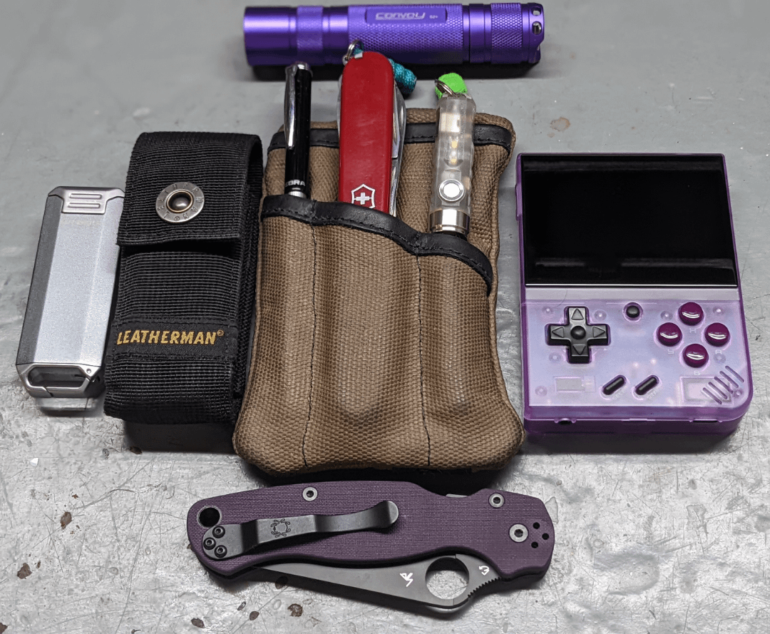 Most of what I’ll usually bring with me to work, rotating flashlights and knives for whatever I want to carry that day.