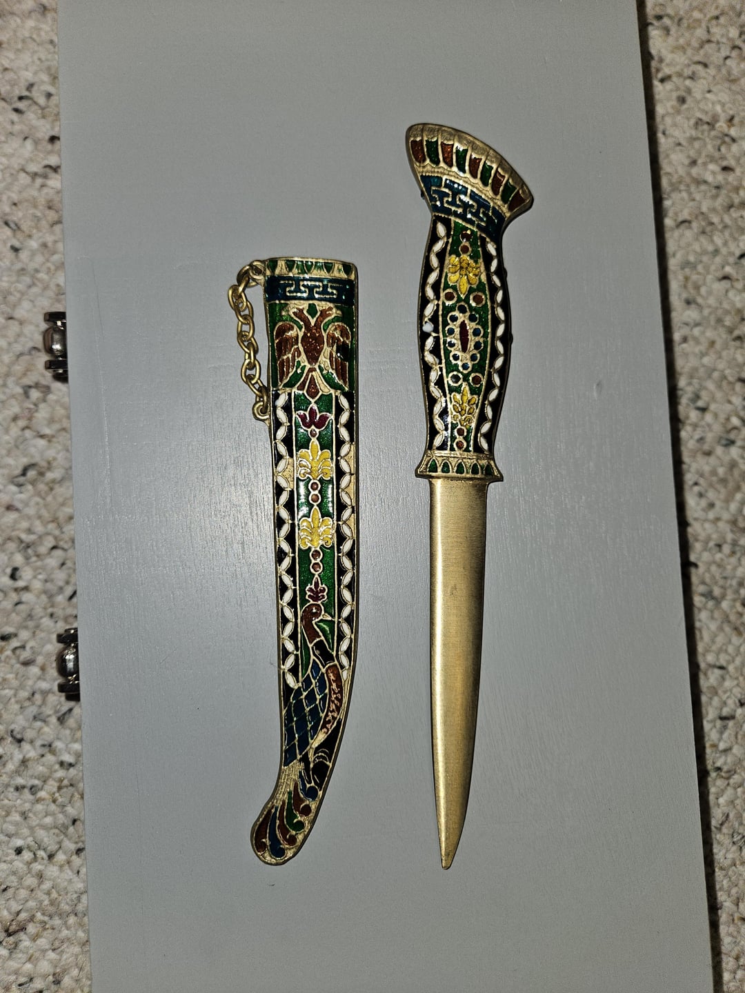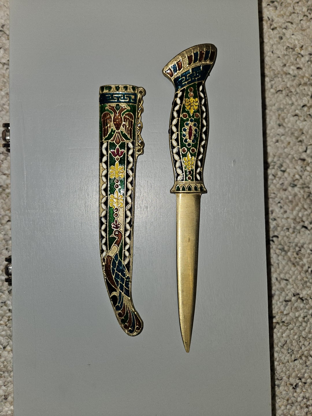 I got this from a great aunt who’s son purchased it from a garage sale in the late 80s. I’m not sure if it’s a replica or an original, but what I believe it to be is a byzantine era blade from the Imperial guard of the USSR. I believe it’s made of copper and enamel. Circa 1800s