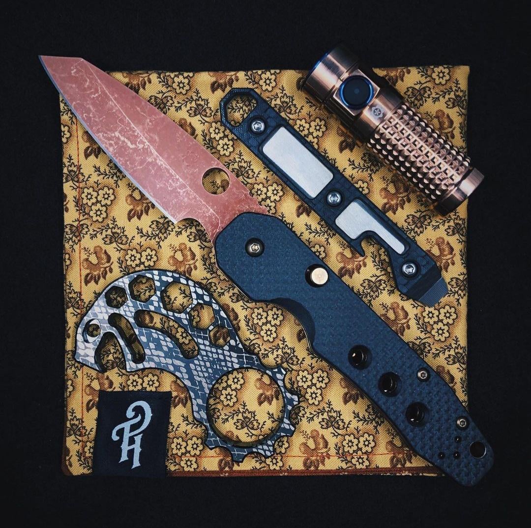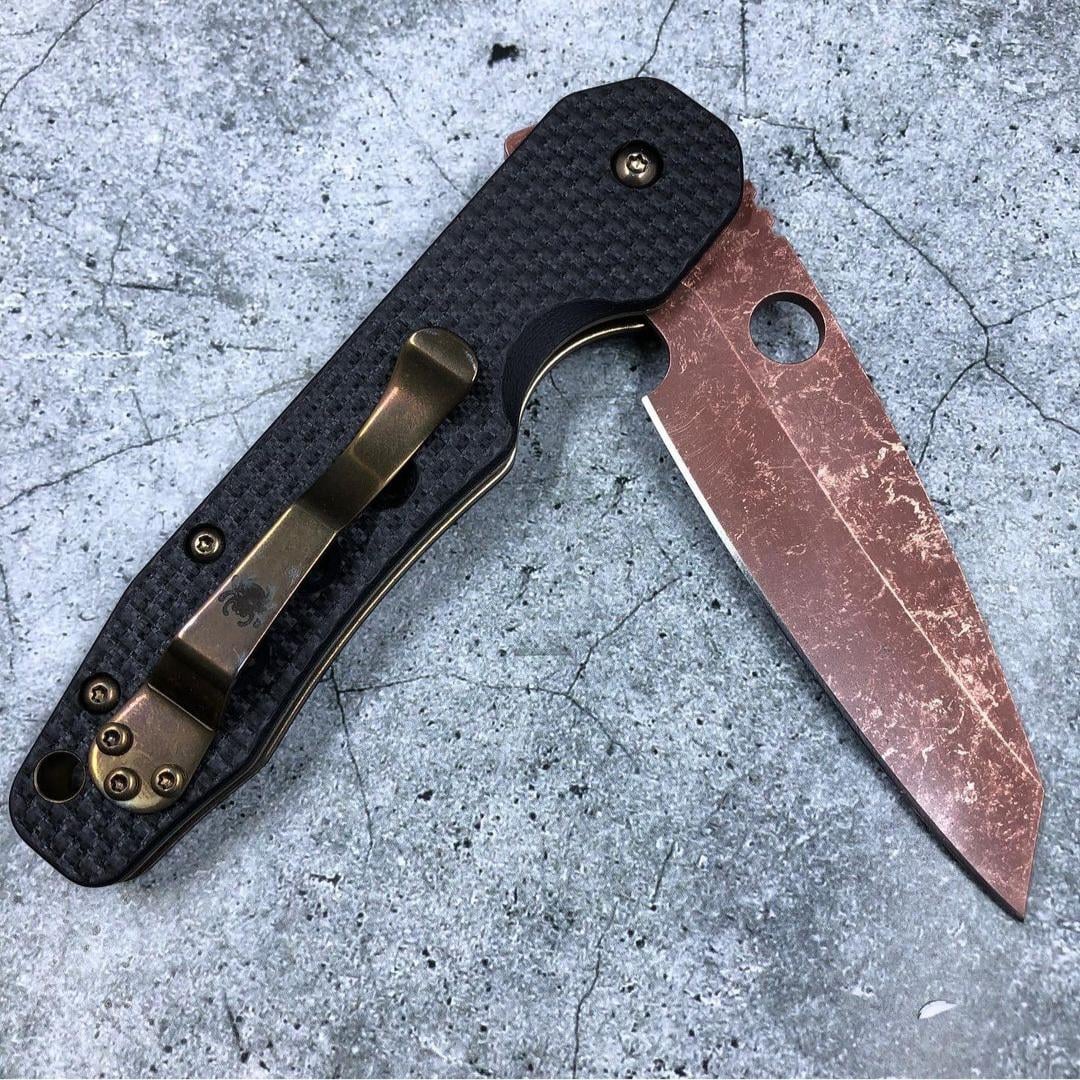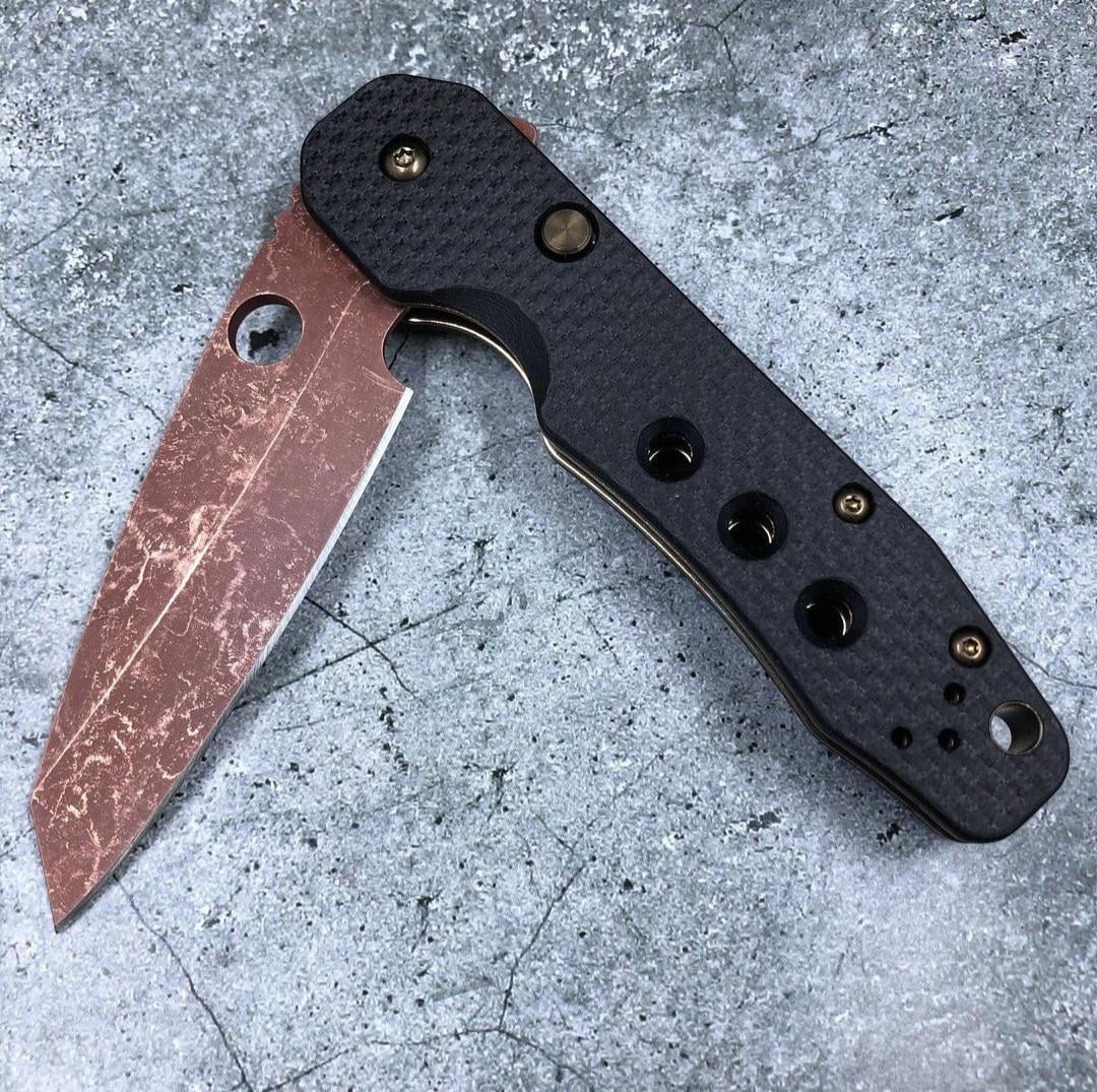 This fully customized Spyderco Smock of mine has had a copperwash treatment done to its blade, Wicked Edge resharpening, and bronze finishing done to all hardware and the clip👍