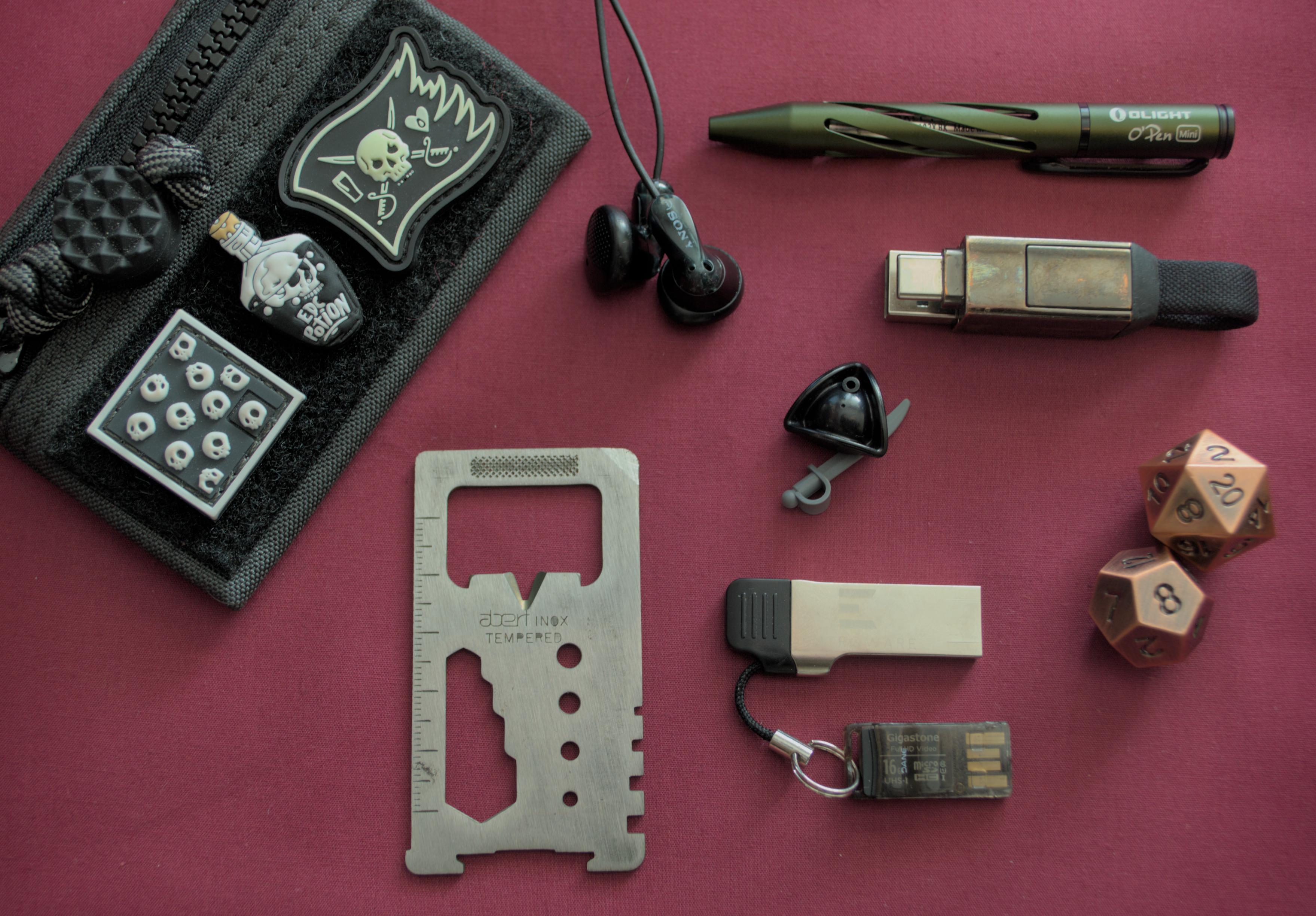 pyratebeard 2 years ago * The Silver Express // charcoal pouch * JRW Gear // black flex bead * ManiacEDC // Nana Mini Hank skull RE * Brotac Gear // EDC Potion bottle RE * LostAtSea // Skully’s pirate flag RE * Rolling Square // inCharge USB cable * Sony // MDR-E9LP headphones * Abert Inox // wallet multi tool * Entroware // USB-C flash drive * Generic // USB SD card drive * Olight // O’pen mini