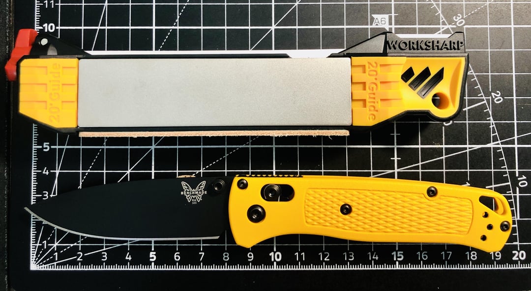 Work Sharp guided field sharpener und the Benchmade Bugout Work Sharp Limited Edition in the premium 20CV Steel