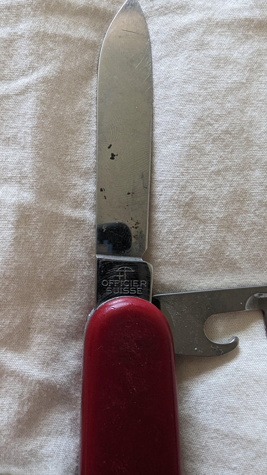I am curious if there’s a way to tell what year this SAK is? I found chart that dated the “Officier Suisse” between ’76 and ’05, but on the same chart is has the “Victorinox Switzerland Stainless Rostfrei” as ’86 to ’08. I don’t know how accurate any of that info is though. I’m also curious what the best way to clean the knife would be? And would any replacement toothpick work? Thanks in advance!