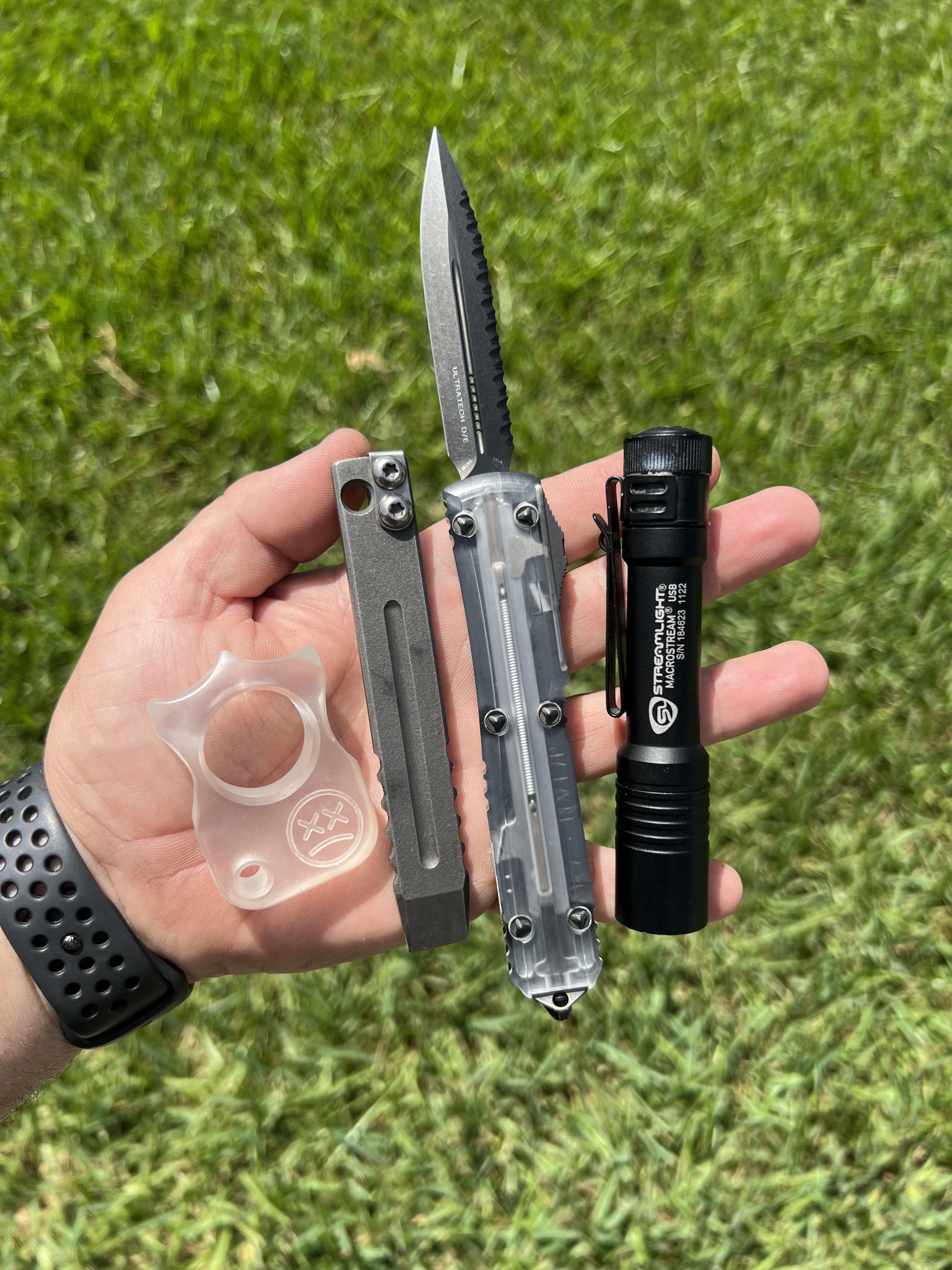 Microtech Ultratech Cleartop- Maverick Customs Titanium Prybar- Streamlight Macrostream – Random Plexiglass Knuck from Etsy