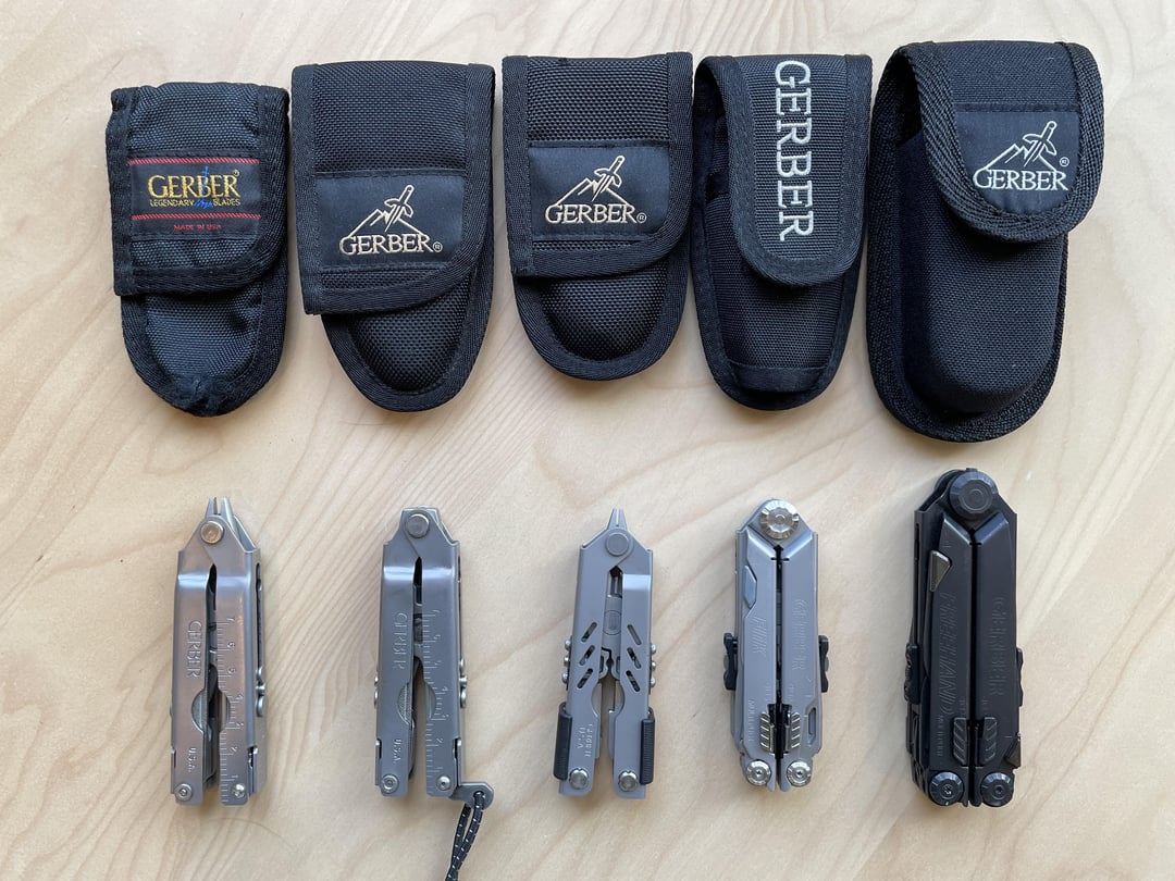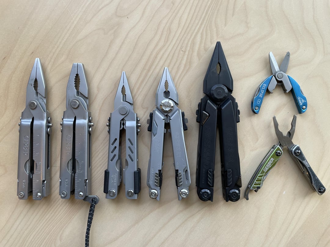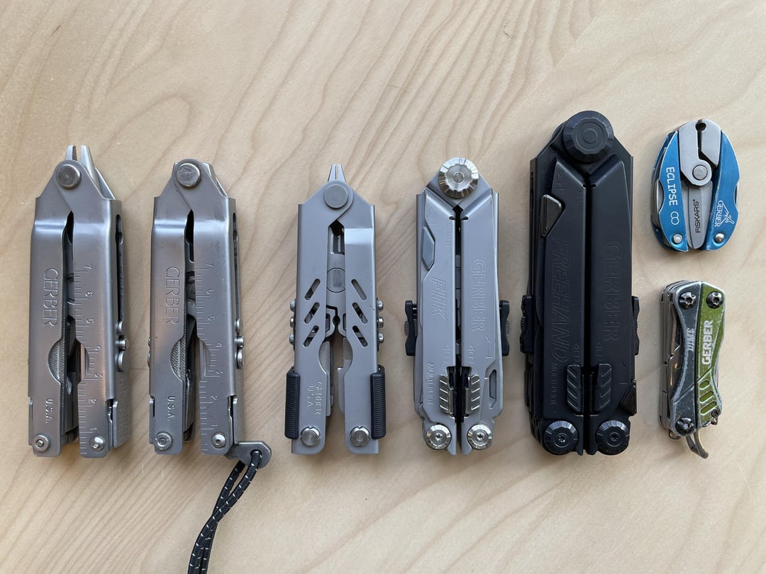 Left to Right: Multi Plier (Needle Nose), Multi Plier (Blunt Nose), MP400 Compact Sport (first gen?), Flik, Freehand Black Oxide, Eclipse, Dime.