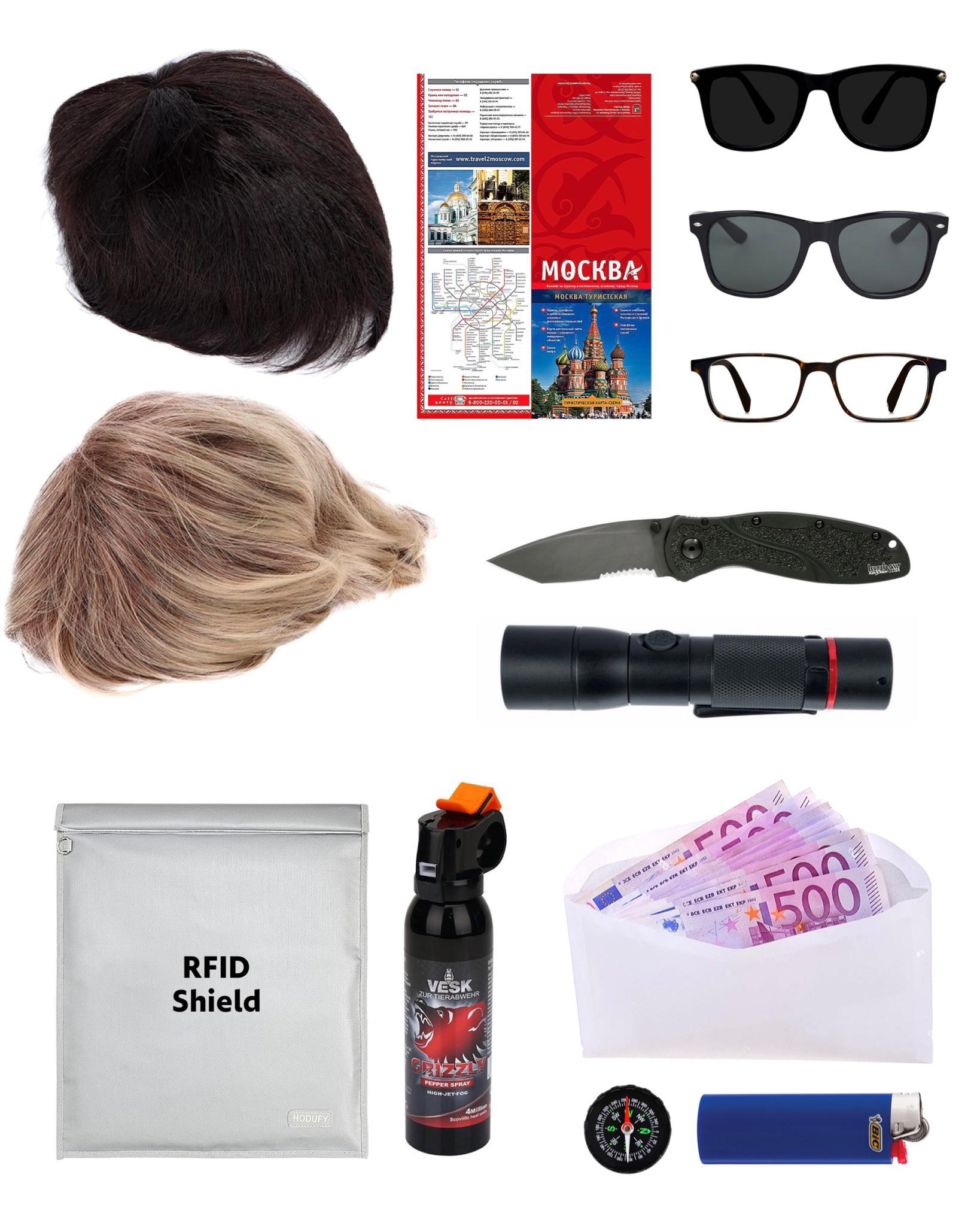 sikeig 3 years ago – Two wigs (Black, blonde) – Moscow city guide – Three pairs of glasses – Tactical folding knife – Flashlight – RFID Shield zip bag – Bear mace – Envelope with thousands of Euros – Small compass – Lighter