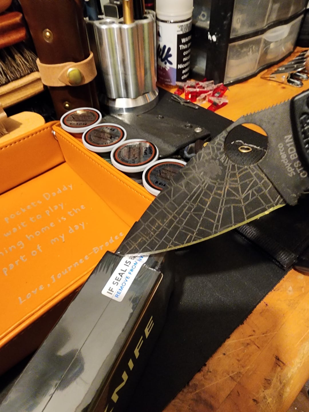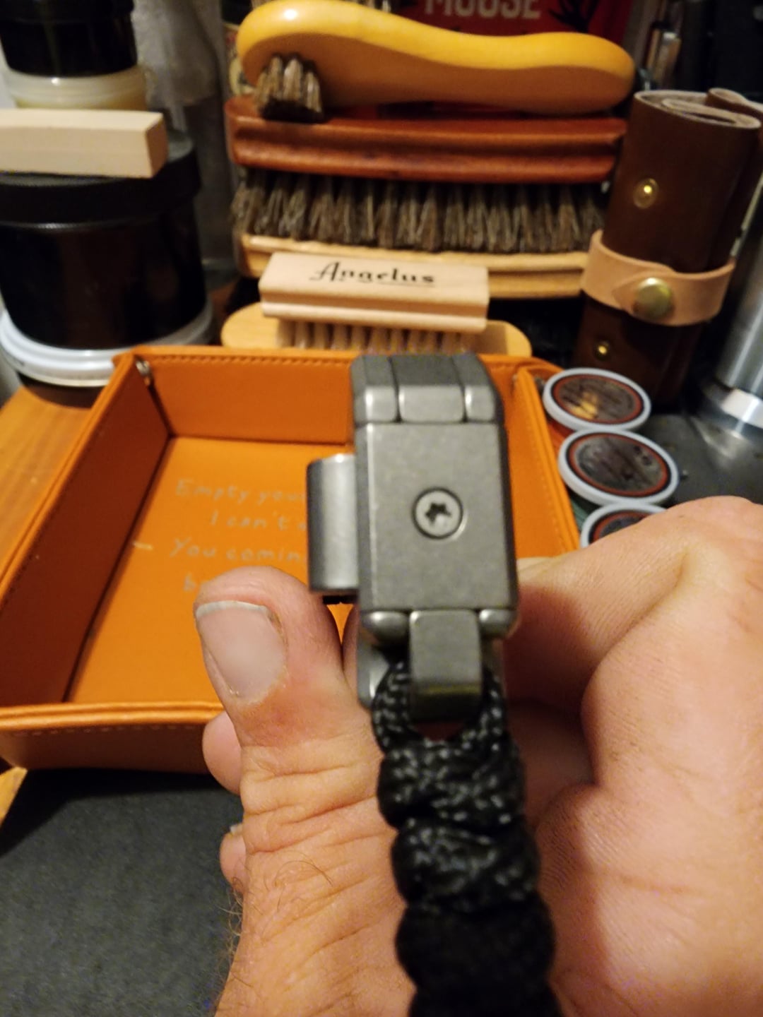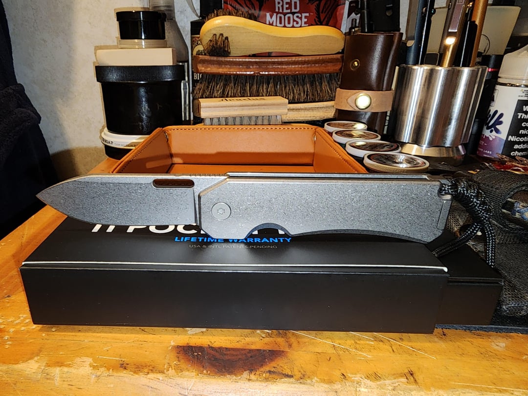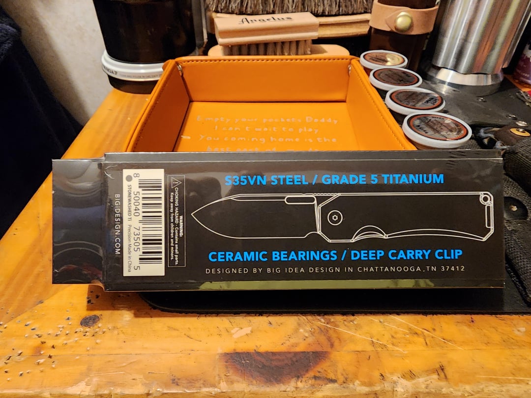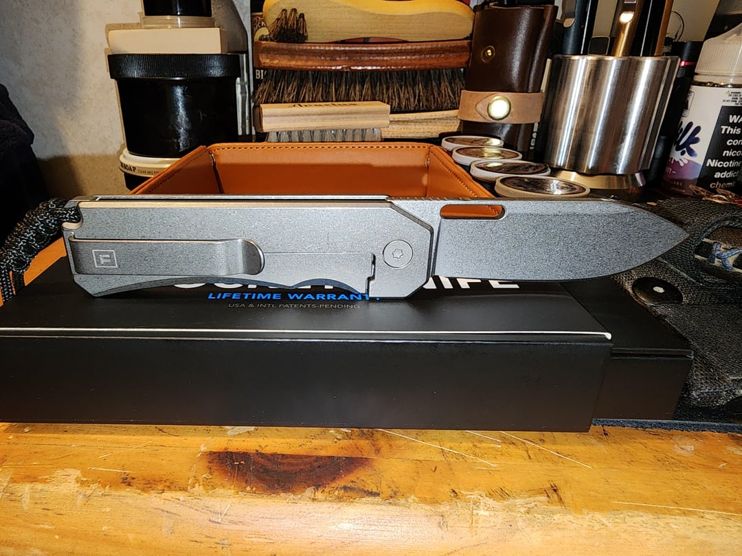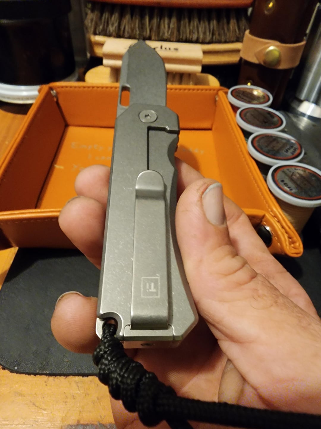 It feels amazing in the hand! Great size. It’s pretty damn hefty considering the titanium handle! S35VN, Titanium frame lock, flipper tab, reversible deep carry clip, single screw holding scales together, on bearings.