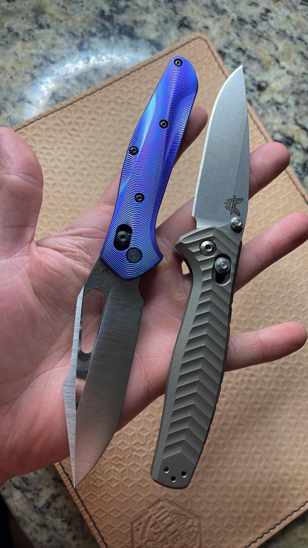 JT1026 2 years ago On the left: •Benchmade 940 internals, REK reblade in cruwear, and RSD Ti scalesOn the right: •Benchmade Anthem 20cv