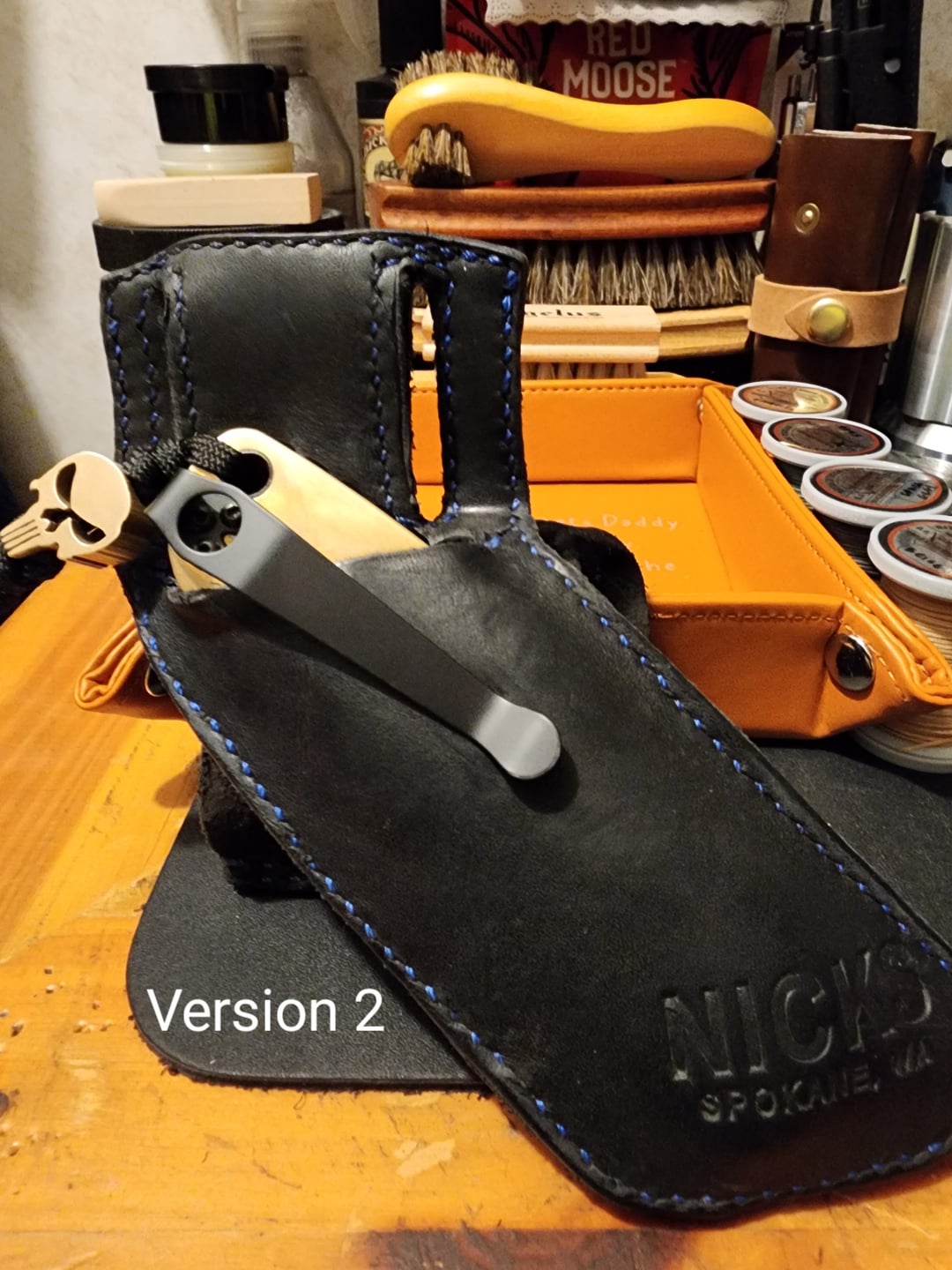 For V2 I wanted to address a couple issues. I wanted to fit more than one knife. I wanted it to be enclosed, because leaving the pivot exposed to the elements was no good. For this I used a Nicks workmat for the leather.