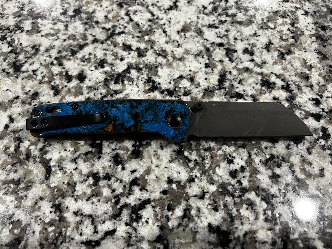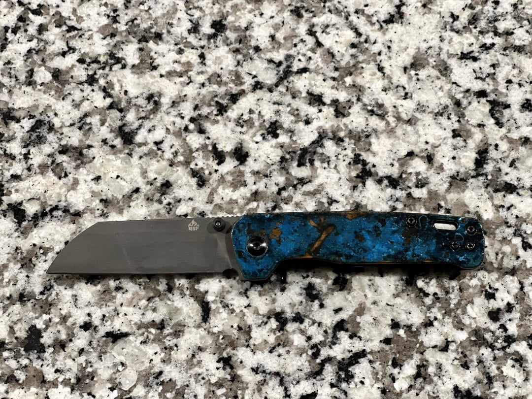 Sharing this project I recently completed. Made a set of 5 of these shipwrecked Penguins as gifts. I’m kind of thinking it’s a little overboard for a $40 something dollar knife, but turned out pretty well. They all started out as the copper D2 penguins. Lightly sanded off the fake patina, did a force patina, acid etched the blades, and added a Glow Rhino thumb stud (blue).