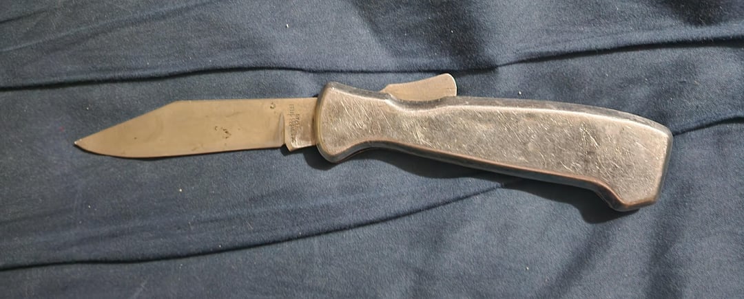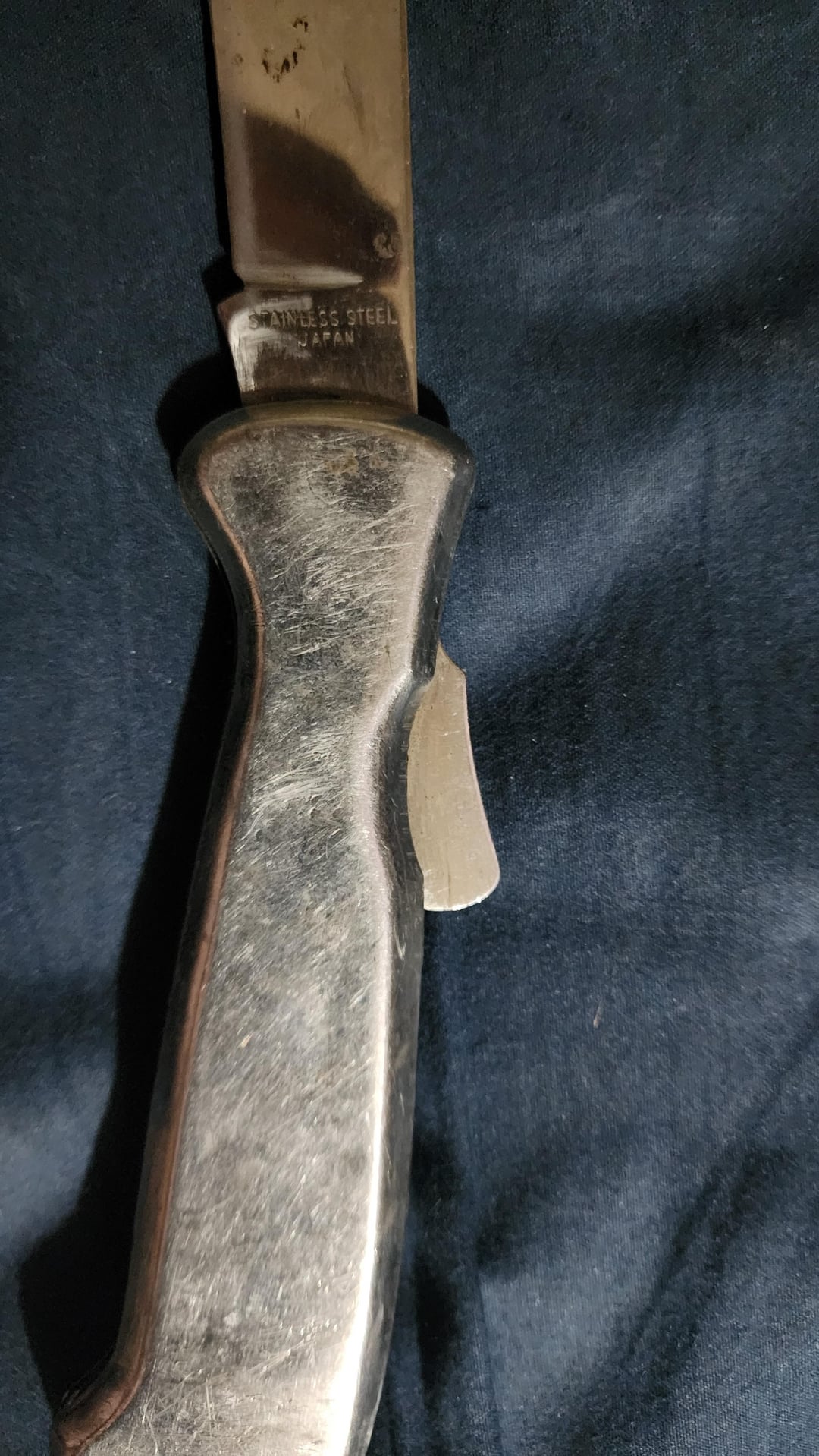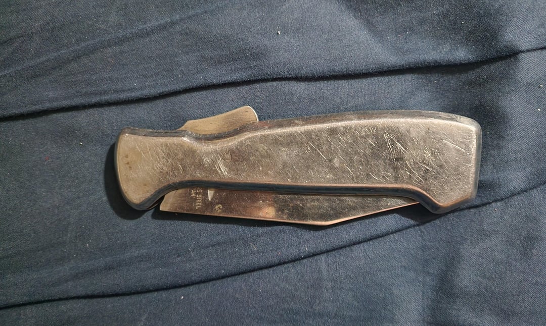 I acquired this knife years ago (I don’t remember how or how much) but it Is so garbage it makes me chuckle every time I bring it out to look at it. It’s stamped out sheet metal that is attached to “stainless” steel construction with the biggest and most clunky button lock I have ever seen. The only thing it has written on it is ” Stainless steel Japan”. I have no idea if it’s actually japanese made but it’s butt ugly and I love it.