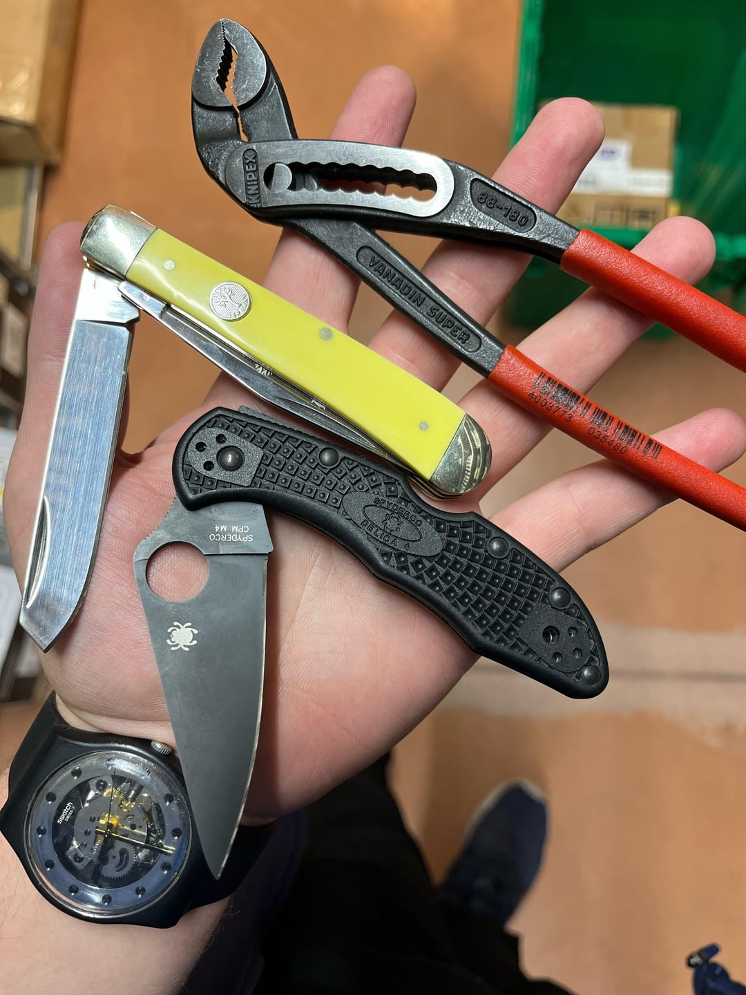 Been super loving slipjoints recently, but my M4 Delica is just an absolute powerhouse. Knipex alligators because sometimes the bolt doesn’t like moving by hand, and a nice Buck 113 to tear through cardboard like it’s nothing. Slipjoints and fixed blades have been my jam for a hot minute lol.