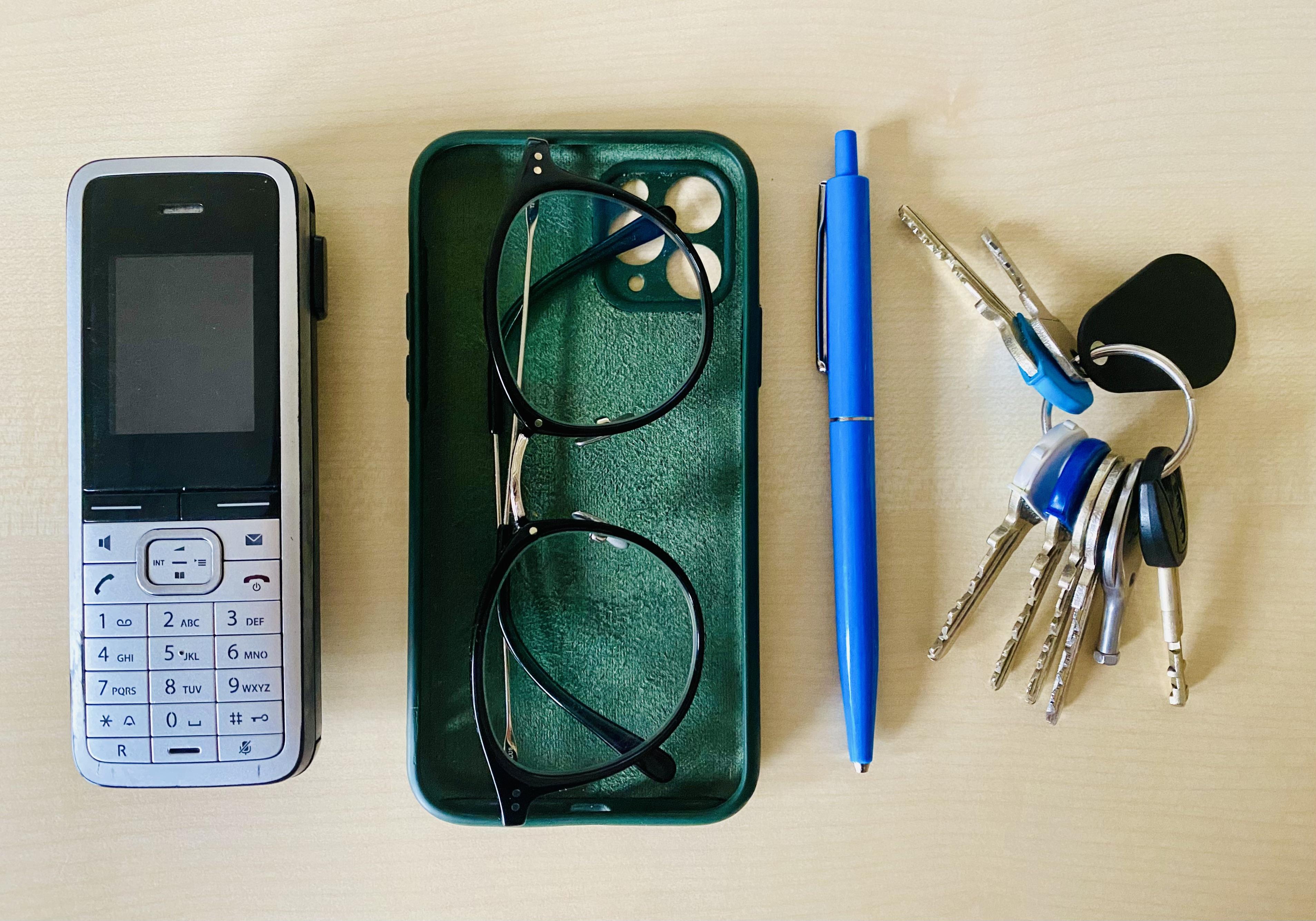 DECT, iPhone, glasses, pen and keys. Nothing much to say.