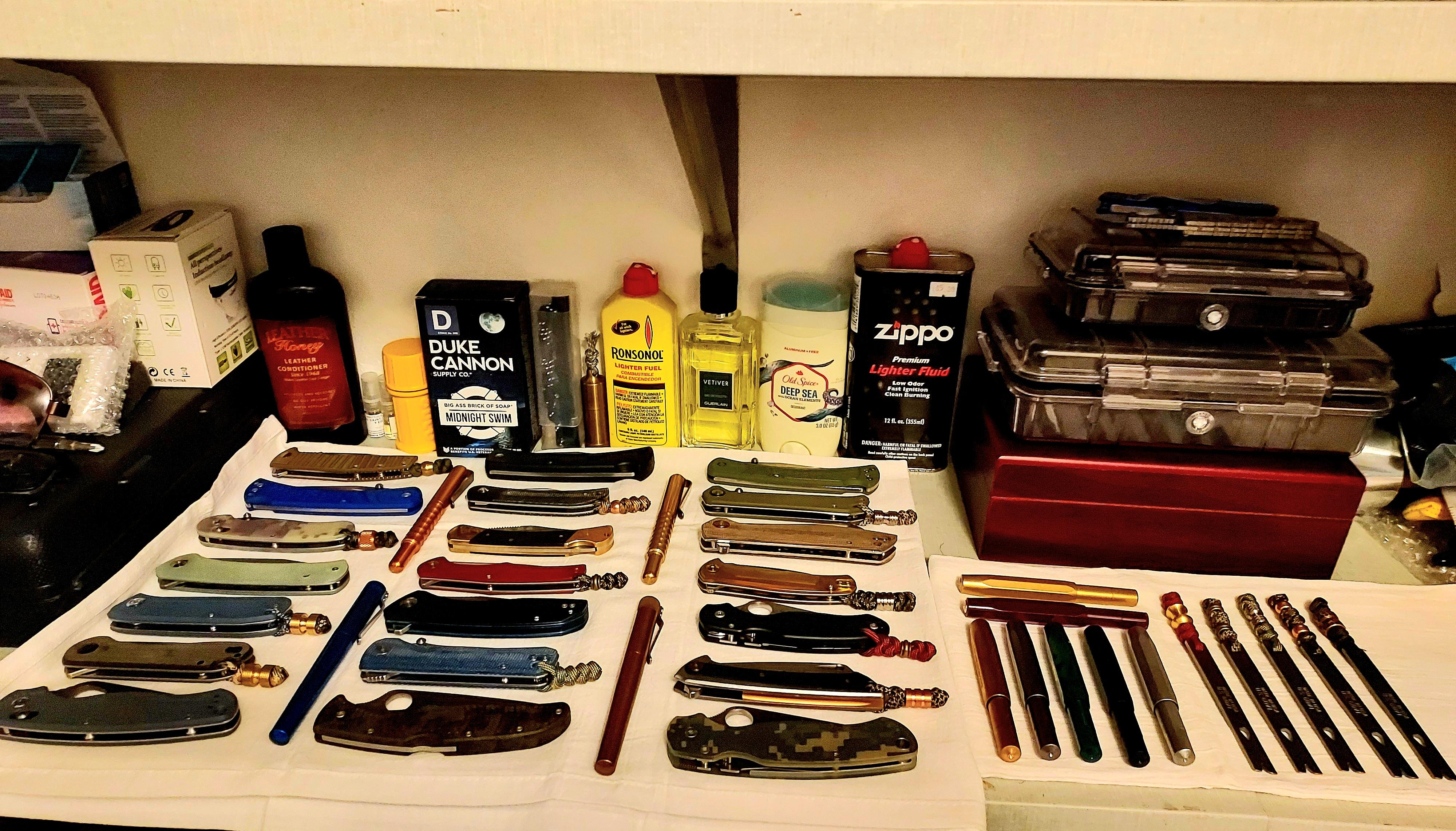 Pens: (Spaced between knives) Prometheus Alpha in copper and brass Karas Kustoms Render K in blue anodized aluminum and copper (To the right) Kaweco Sport Rollerballs in Steel, Brass, Bronze, Anthracite Aluminum, Powder Black Aluminum, Forest Green, Burgundy