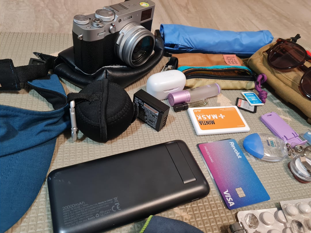 Tech: Fujifilm X100v, wide lens converter, SD cards, spare camera battery, 20000mah battery, wires C and A wires