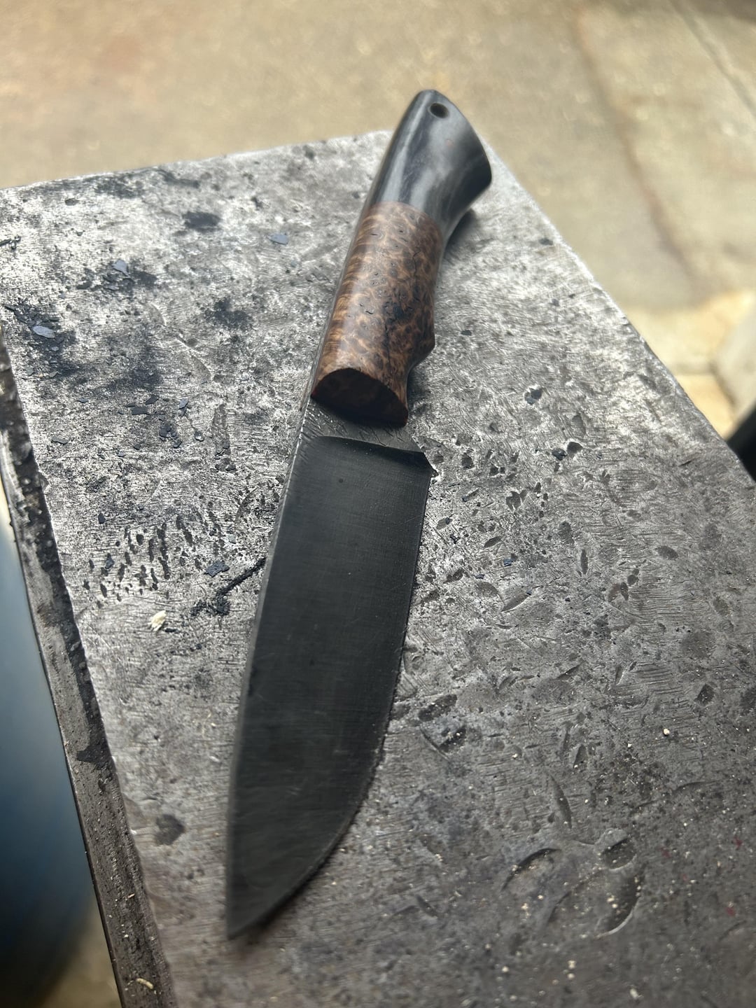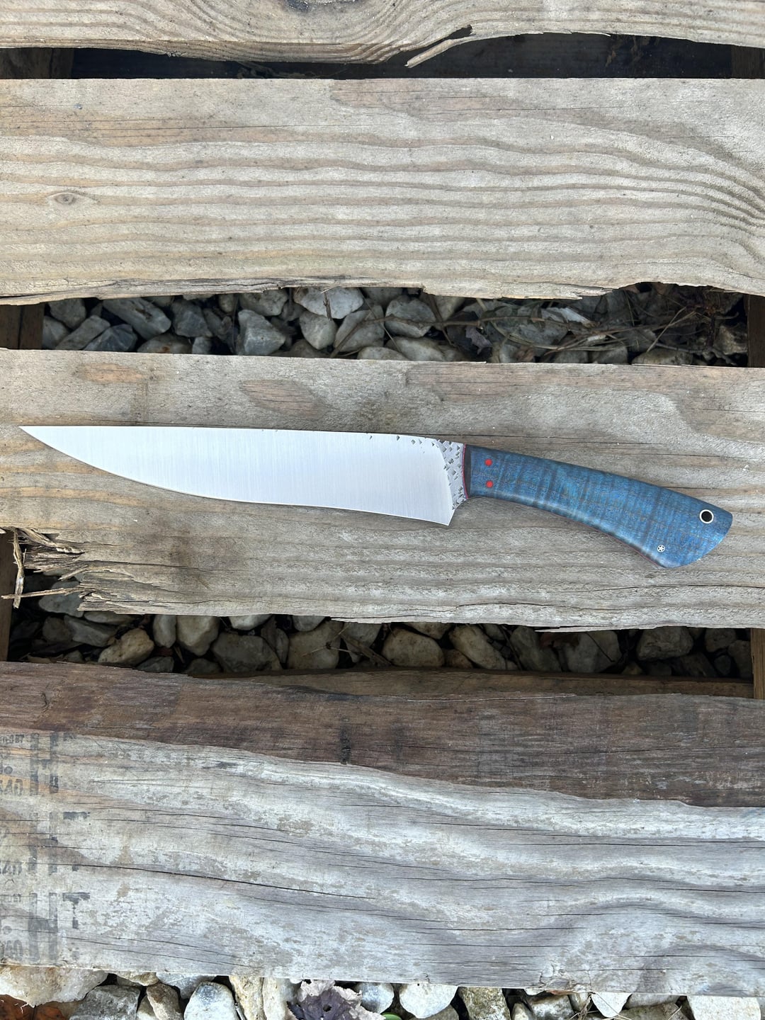 8.5” TL 4” BL Antiqued 5/32” 8670 textured and a tapered tang.