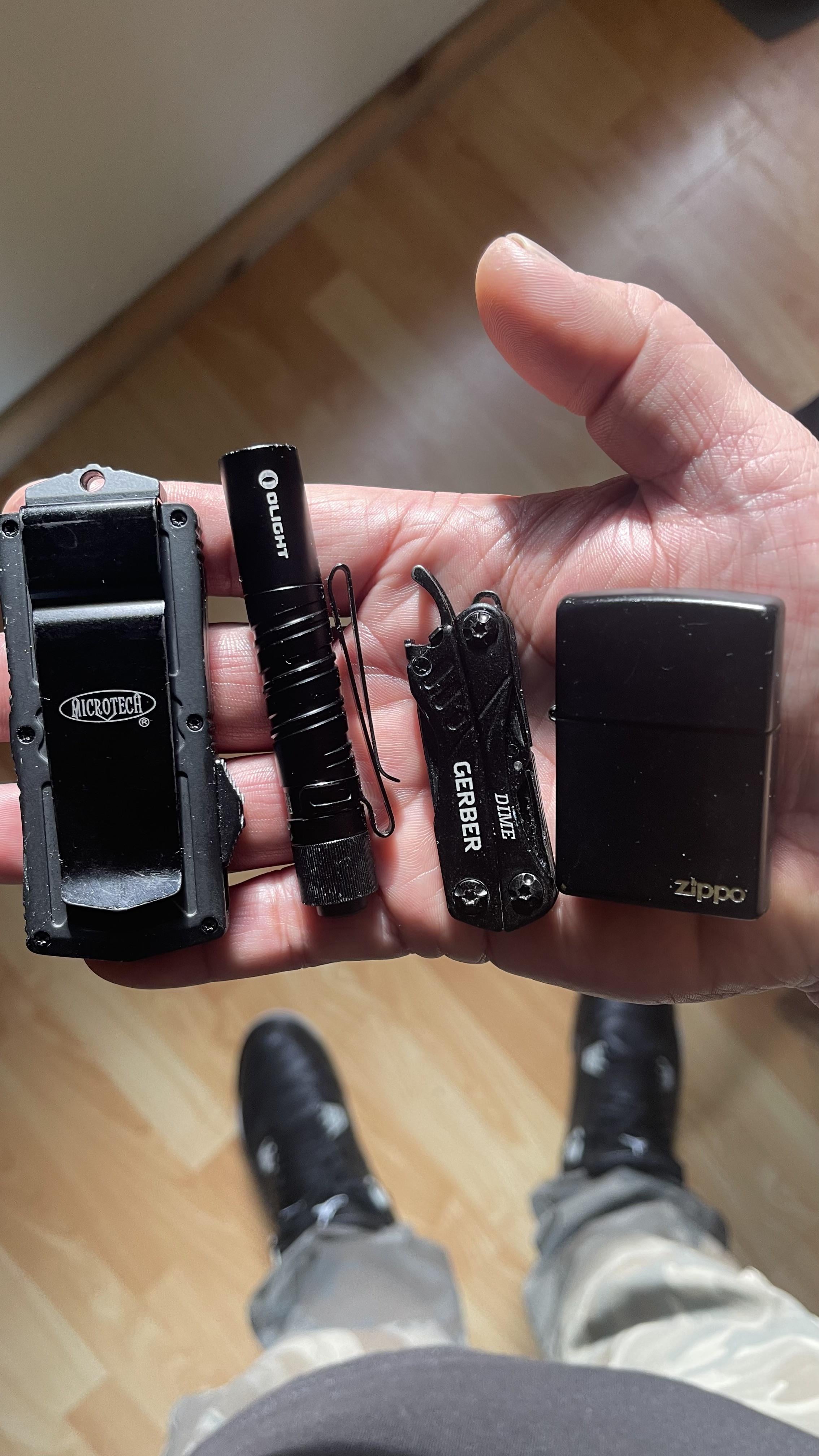 sckmahoe 2 years ago Microtech 157-1T Exocet OTF (replica from Wish.com)i3T EOS (olightstore.com) blackGerber dime (Amazon.com) blackZippo lighter (eBay.com) matted black brass case