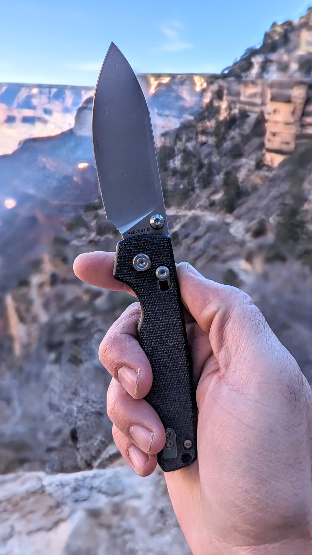 Full review will be on YouTube, but this little budget blade has blown me away. Vosteed nailed the cross bar lock, no play, and using Sandivic steel is sooooo much nicer vs boring old d2. There is a lot to love about the nicely done comfortable micarta and the edge has stayed razor sharp through moderate use cutting open presents, making fire sticks, scoring PVC pipe, and a few zip ties. The tip is strong and belly is a nice path for slicing, it’s a thin grind. Vosteed has me looking at other models probably the Thunderbird next. I was expecting the knife to be at par and got much more.