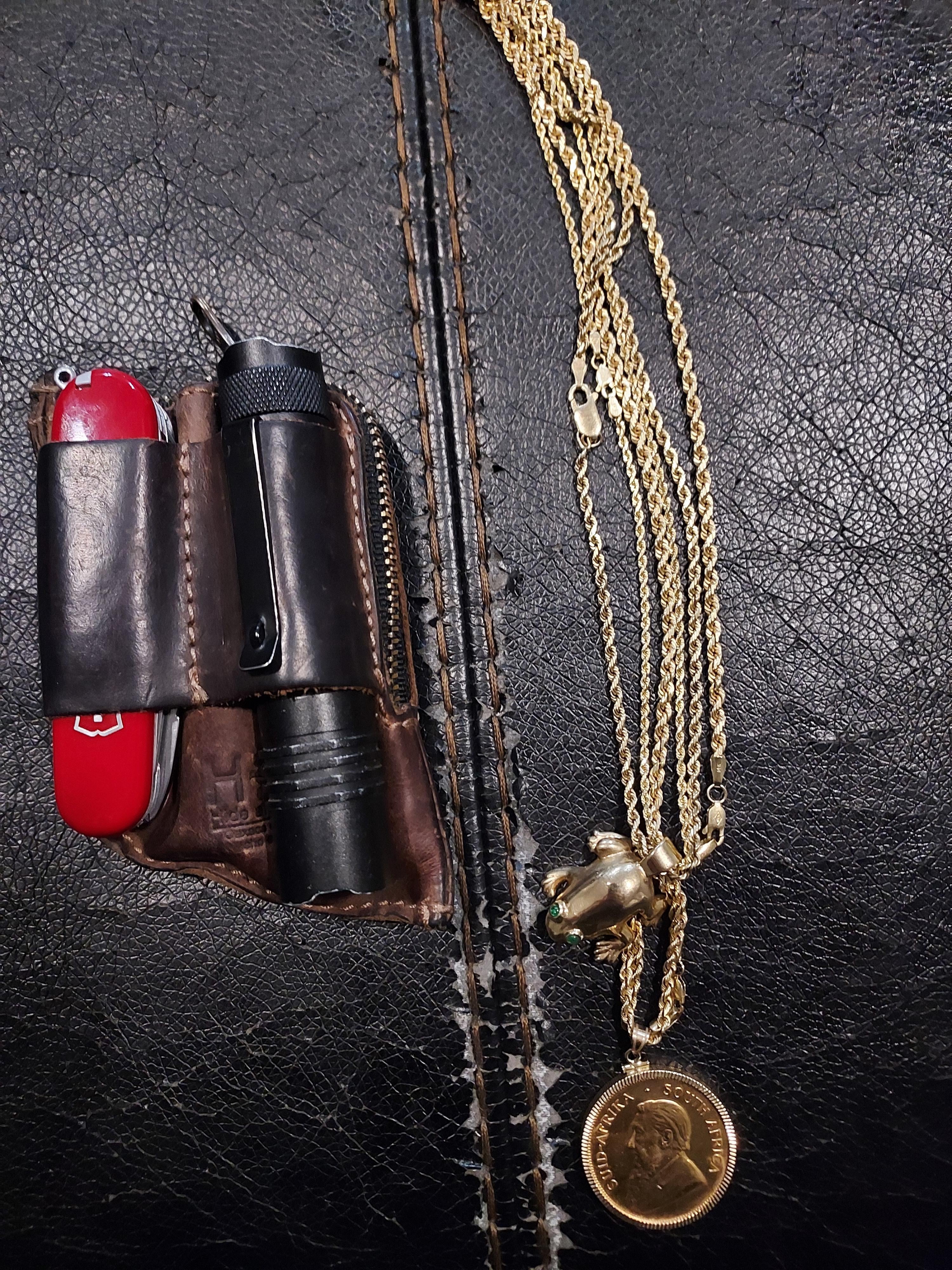 I started carrying this wallet a couple years ago (originally with a SAK fieldmaster) and have never left home without an important EDC item since. The zip up wallet also allows me to carry cash, cards, and a spare 123 battery for the flashlight. If you were like me and sometimes leaving your flashlight or knife in another pair of jeans, the Hide and Drink edc wallet is a life saver.