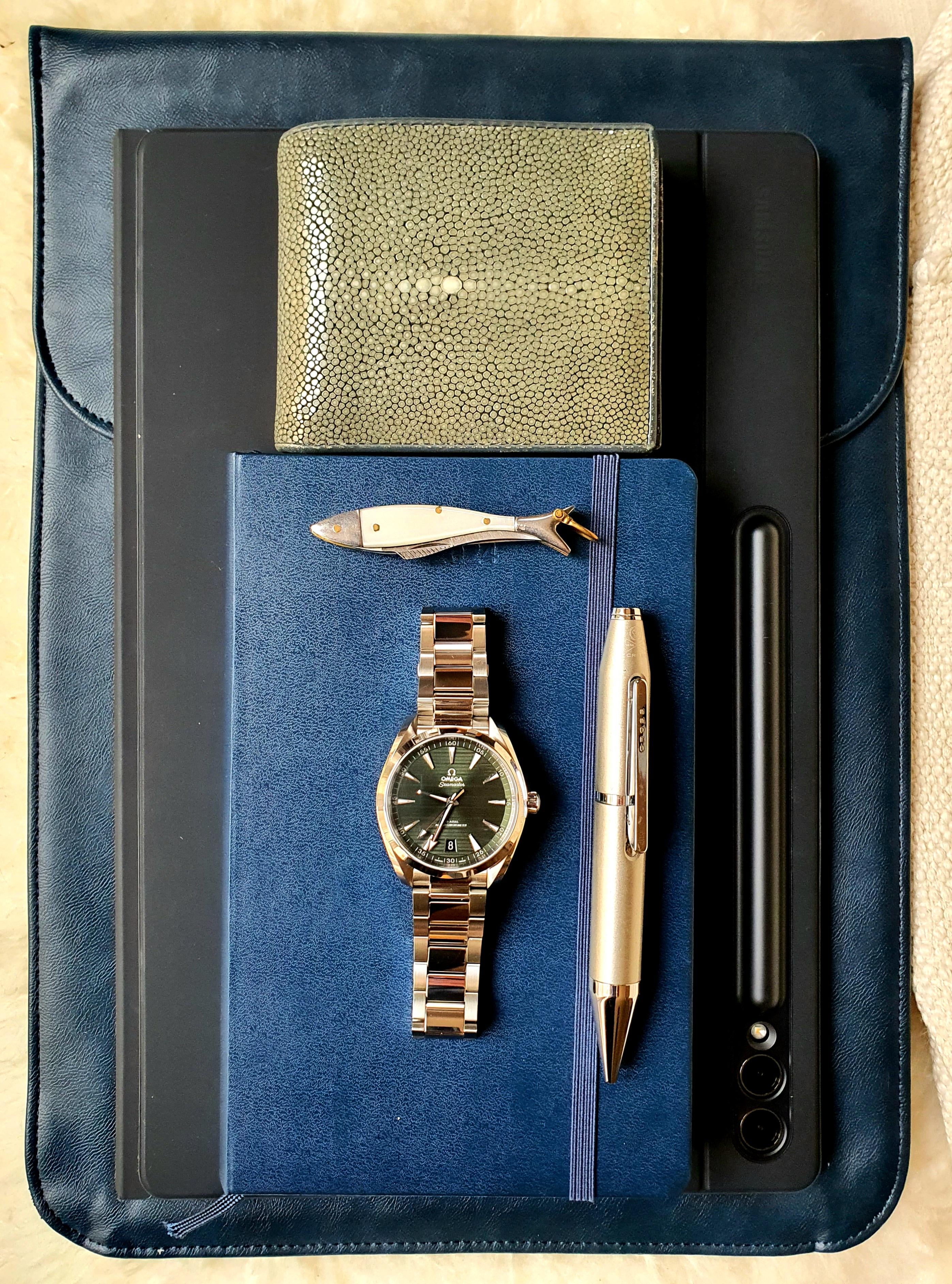 Omega Aqua Terra , great-grandfathers knife, Cross X Gel Ink, Moleskin Planner, Samsung Galaxy Tab 9 Ultra, Stingray Wallet