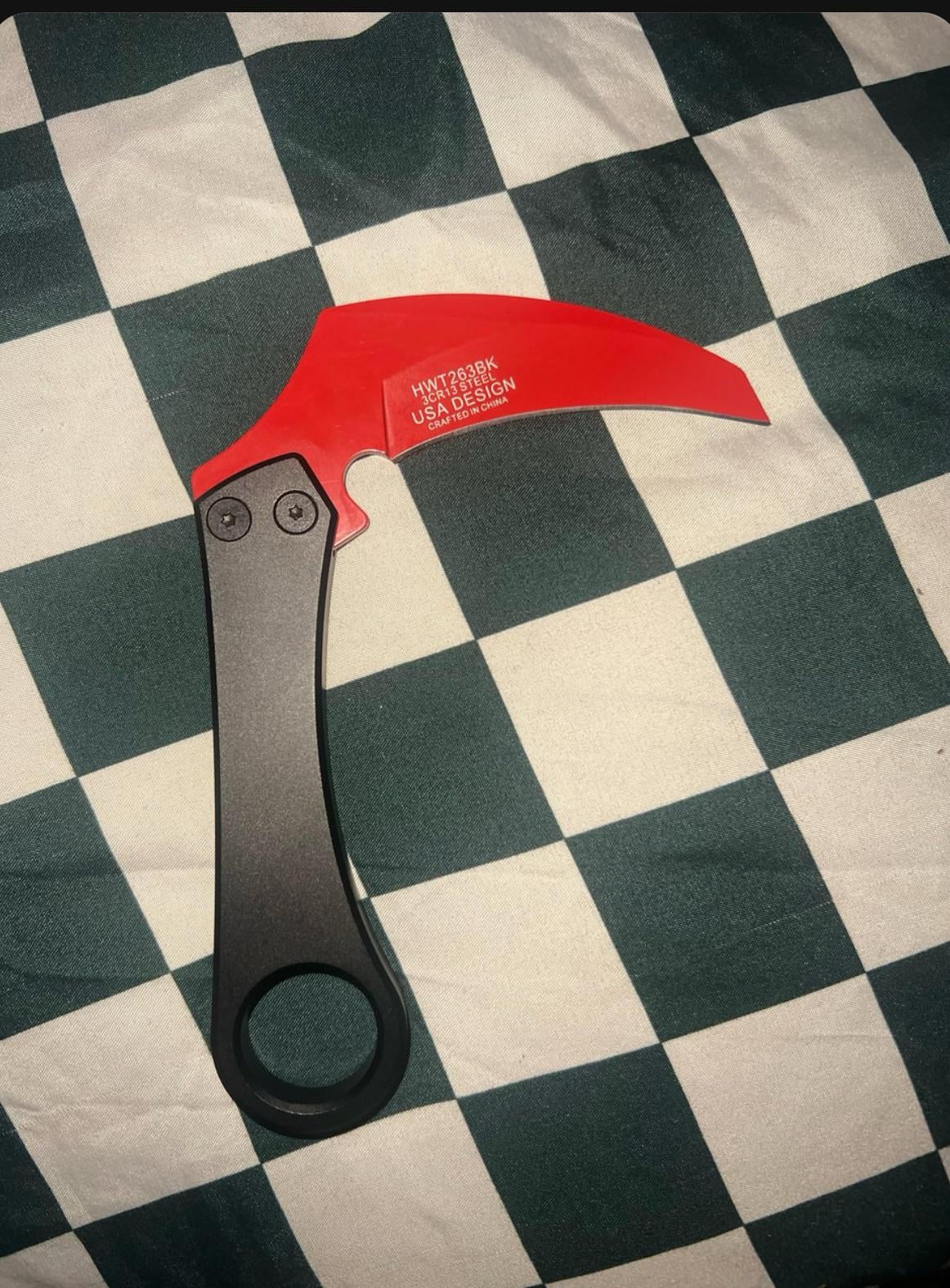 Its an extreme karambit, or a useless kama. I would say the 3cr steel is an admition of its own cheese.