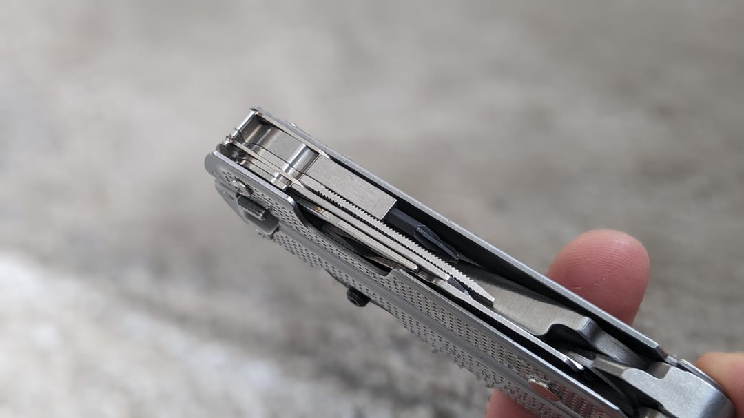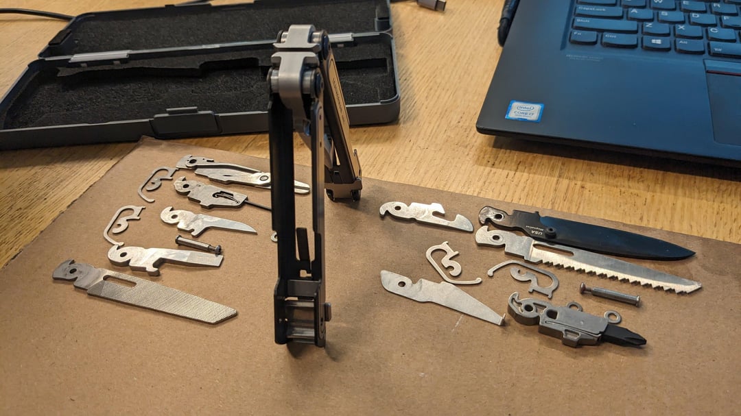 I took a pair of calipers to everything on both tools and [built a spreadsheet](https://docs.google.com/spreadsheets/d/e/2PACX-1vTqN8mHIWE9VC5sghlyX5CVjtlh9SUo8sbkyeKt-XC2aMBmNKNI4h18HwqSIXG1Yv9qcJwtZGuzV3xs/pub?output=pdf) to help build out what I think is a pretty damned good final set of tools. I was able to fit in everything I thought was most useful, but the one thing to make note of is that I was only able to fit in 1 of the two spring arms on the knife-side arm so I could fit in the Awl as well. It works fine overall with the weaker spring action, honestly it’s really only mildly annoying because the magnet will tend to pull the tools back down unless you intentionally deploy them further out initially, more so than the other arm. I can live with that.