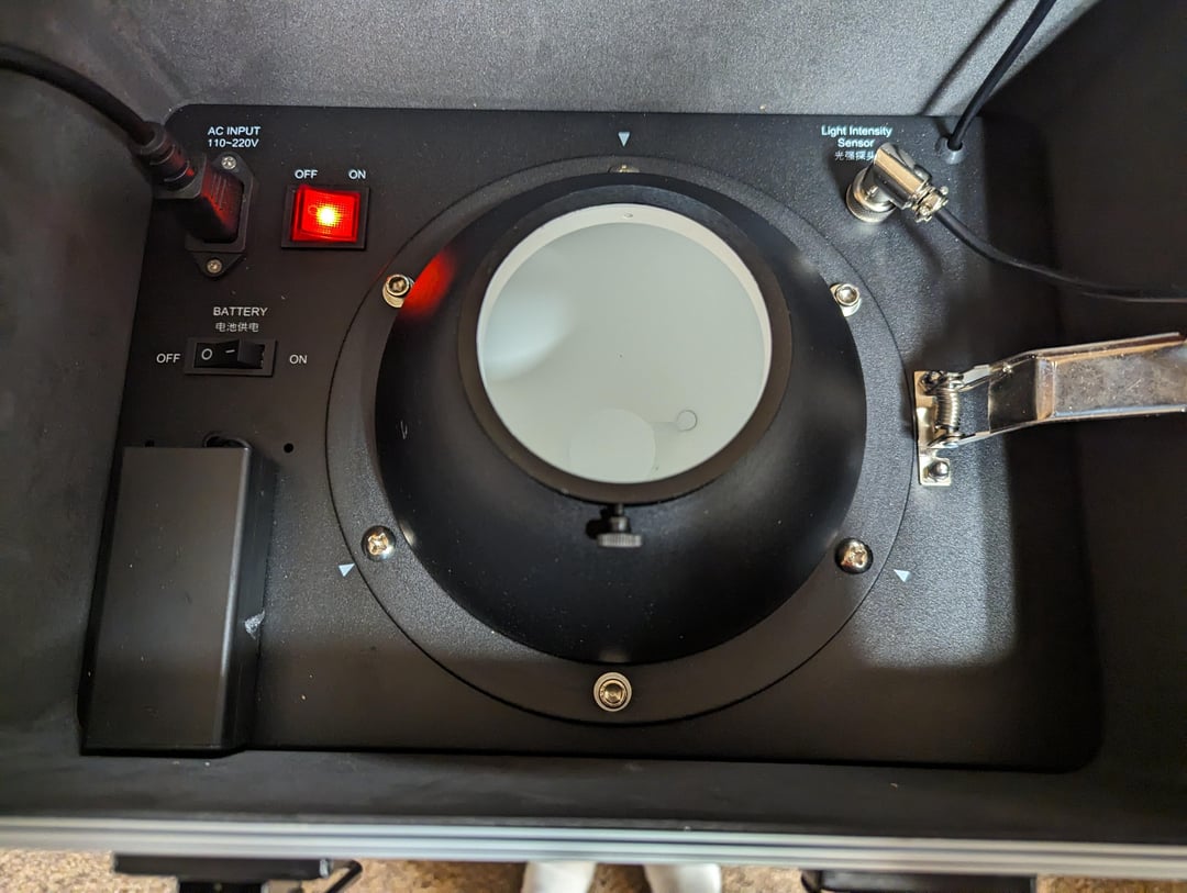 As a product, this is awesome – very well built, very portable, simple and very easy to use. Includes a cable for wall power and has the option for battery power. There are rings for three different sizes of lights, which is nice. Sadly it is neither large enough nor has a high enough ceiling to measure lights like the X75 and MS32