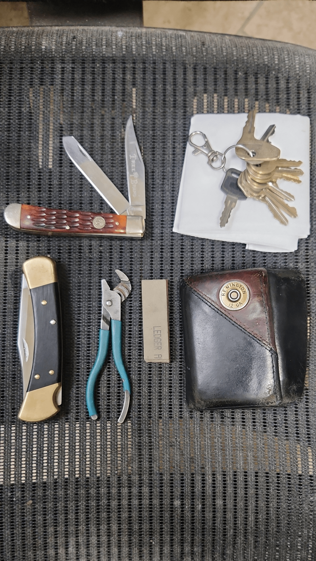 MindlessProfession56 2 years ago Boker trapper and buck 110 for knives, Remington wallet, Off brand small pliers, Keys, A pocket sharpening stone with some leather glued to the back of it, Cotton handkerchief