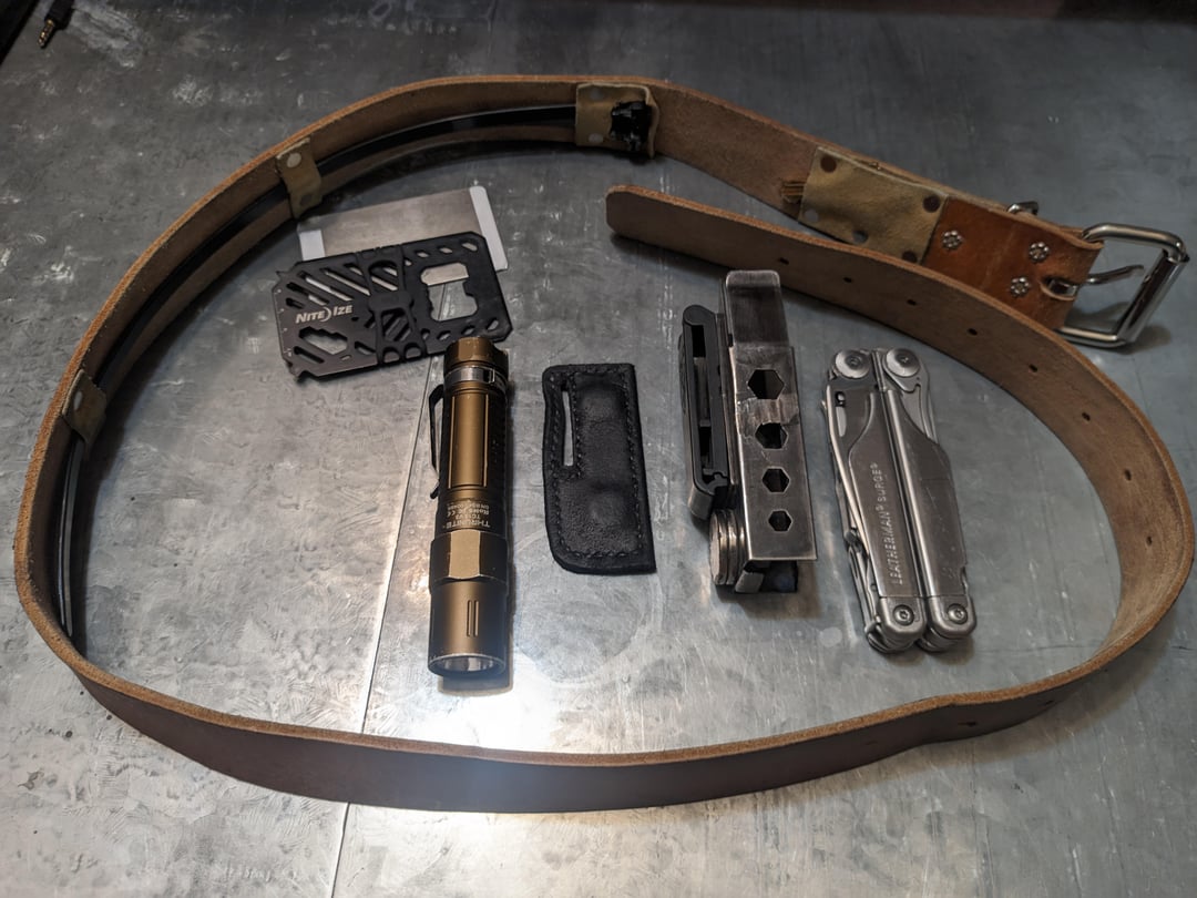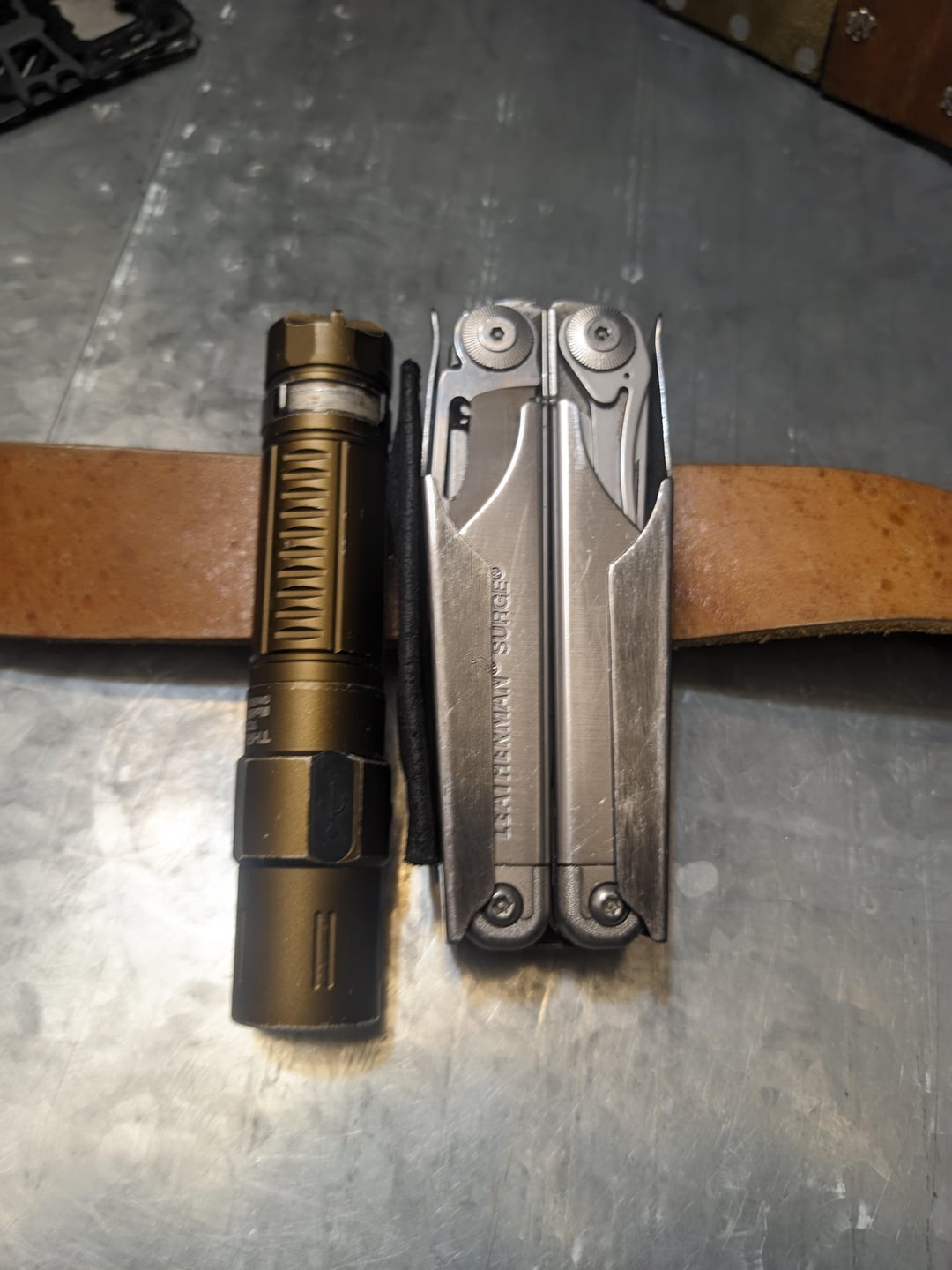 Leather guard with magnets inside to stop leatherman and flashlight from banging against each other.