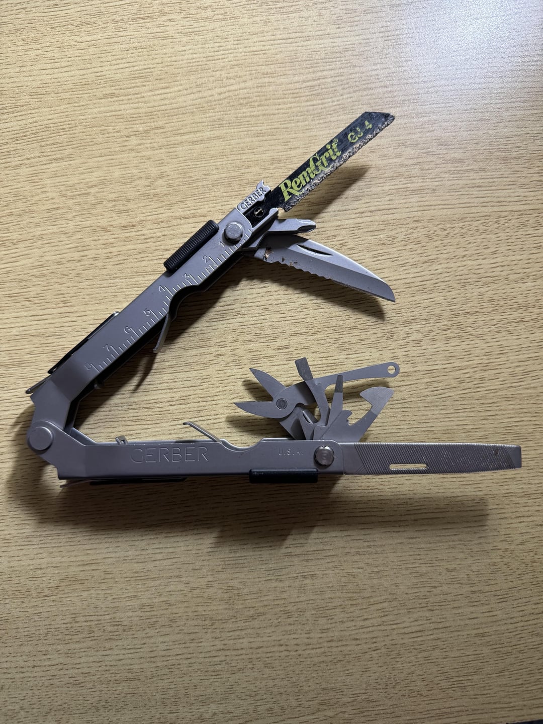 This is the Gerber MP650 and was given to me by my father in law 10+ years ago. He worked for a USAR task force. When he gave this to me I knew nothing about multitools, quality tools, or anything in general. I learned a few years ago that it was highly collectible and very sought after.