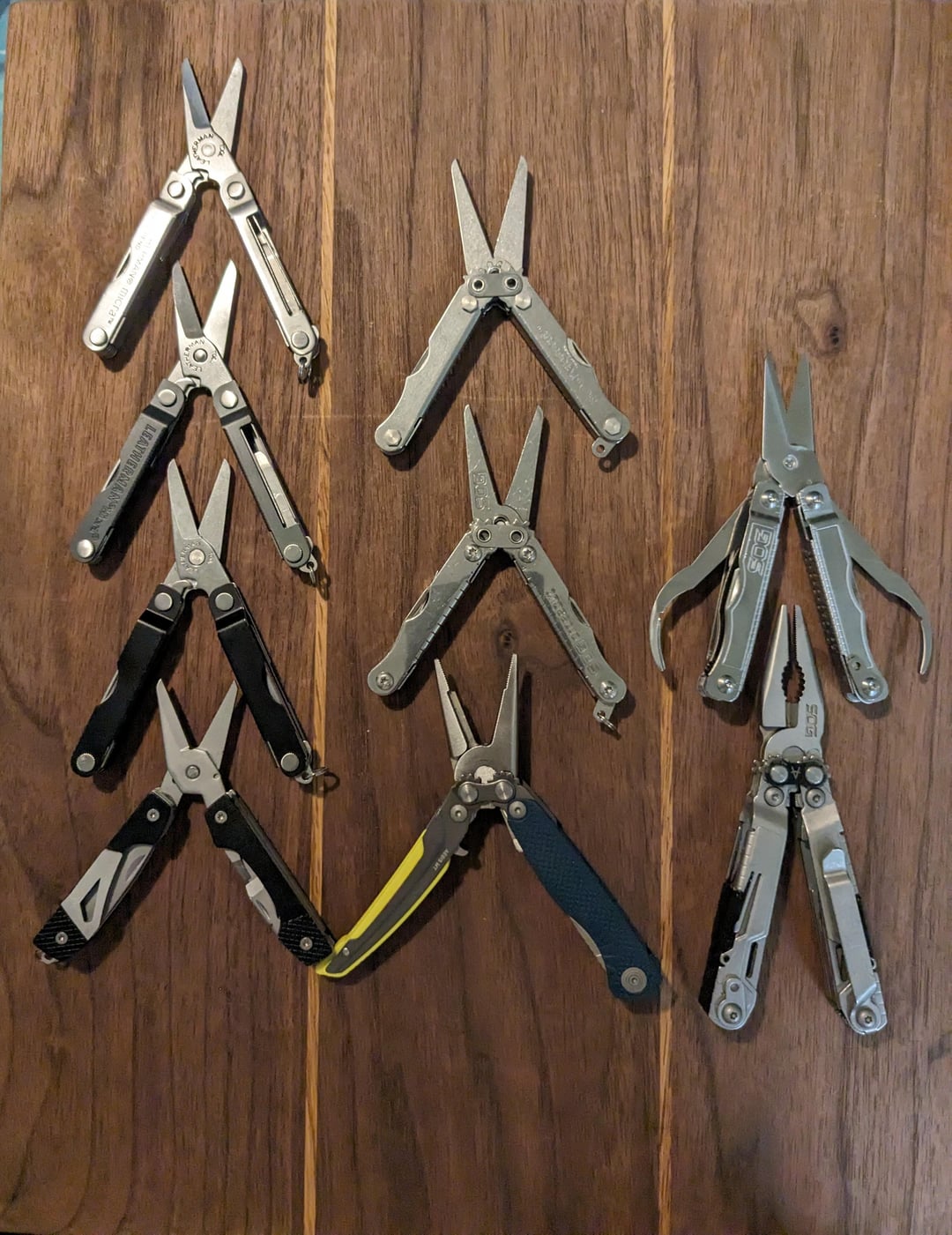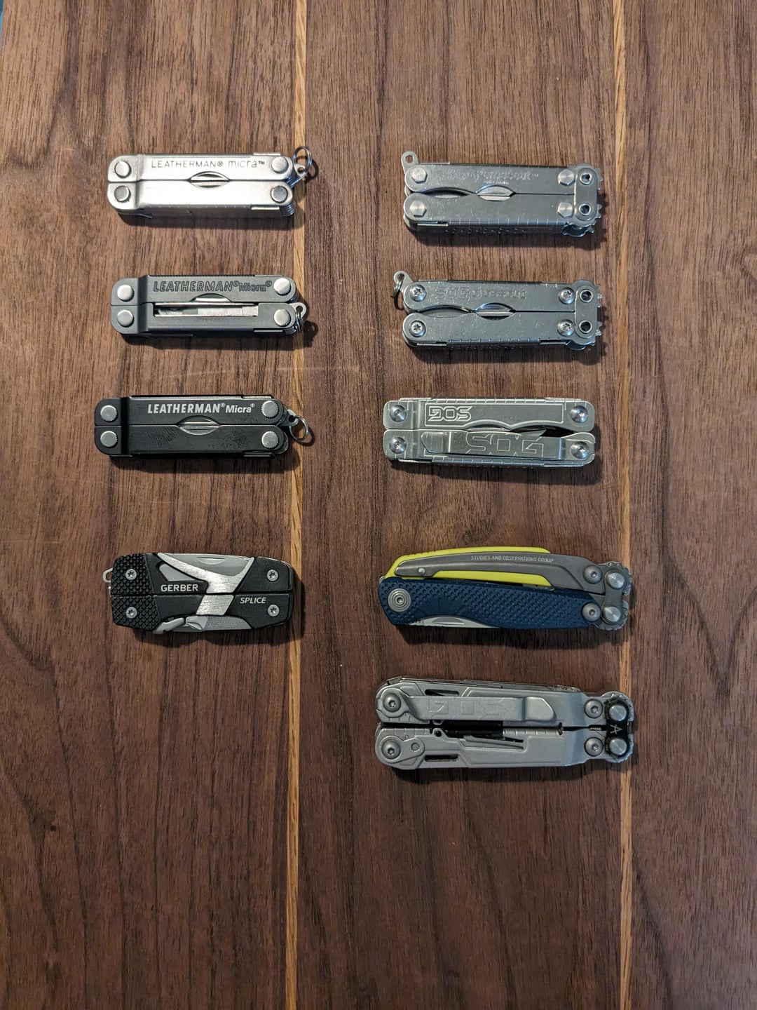 I like to keep a little MT in my pocket. I’ve had a few others that I have broken like my Leatherman Squirt, a few I have lost like my Style CS…lost to the TSA. On the left we have 3 Leatherman Micra’s and a Gerber Splice (absolutely would not recommend the Splice) On the right I have a CrossCut, CrossCut 2.0, Snippet, Aegis MT, and PowerPint.