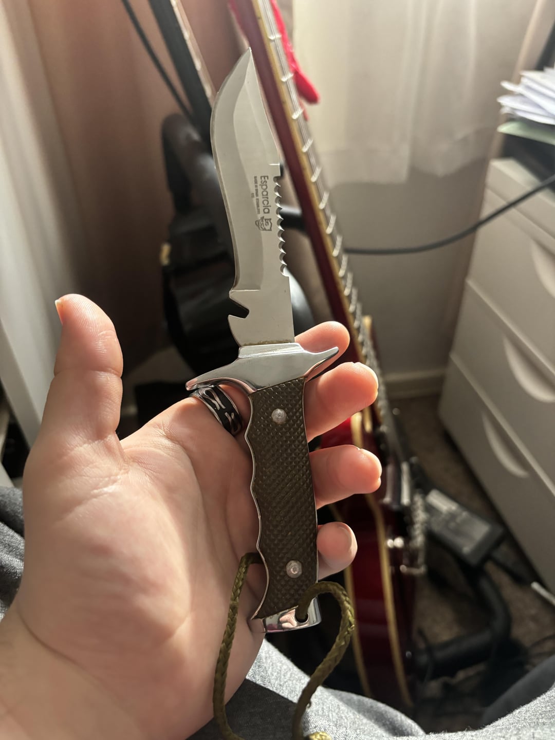 My second knife ever and a an absolute beast. It was gifted to me because I’ve got a bit of an obbsession with knives, and almost everyone of my friends knows this. They usually ask me if I can fix up or clean an old knife straight out of a horror movie they’ve had lying around in a bassement but usually I refuse. However this one was not rusted and is only a little dirty, couldn’t pass up. It belonged to my friends uncle, who said he had no use for it and gave it to me.