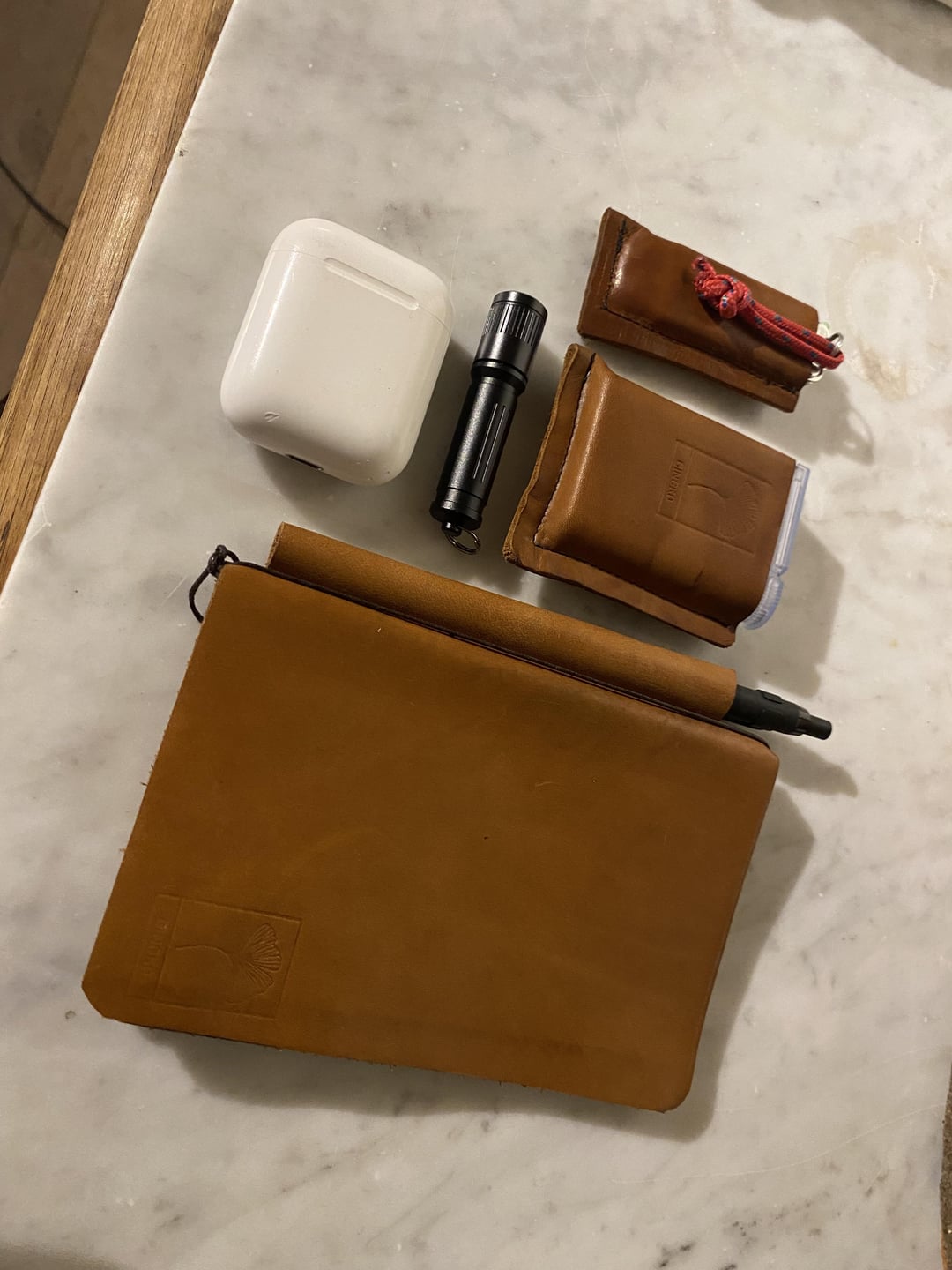 Including: mini leatherman Micra, mini flashlight, Jordan toothpicks, pin, Moleskin dotted notebook, thin 3H pencil.